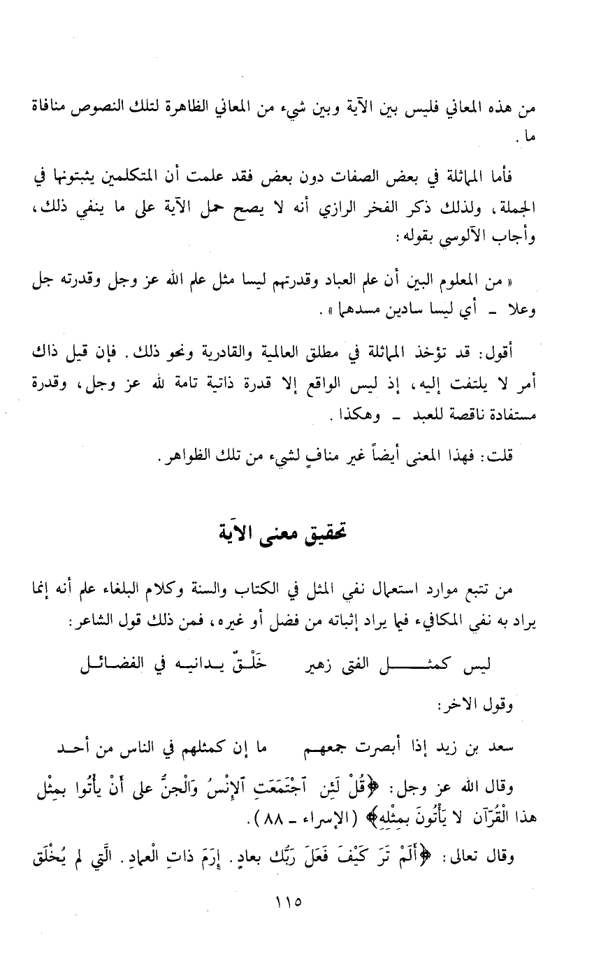 فأما المماثلة في بعض الصفات دون بعض فقد علمت إن المتكلمين يثبتونها في الجملة، ولذلك ذكر الفخر الرازي أنه لا يصلح حمل الآية ما ينفي ذلك، وأجاب الآلوسي بقوله: