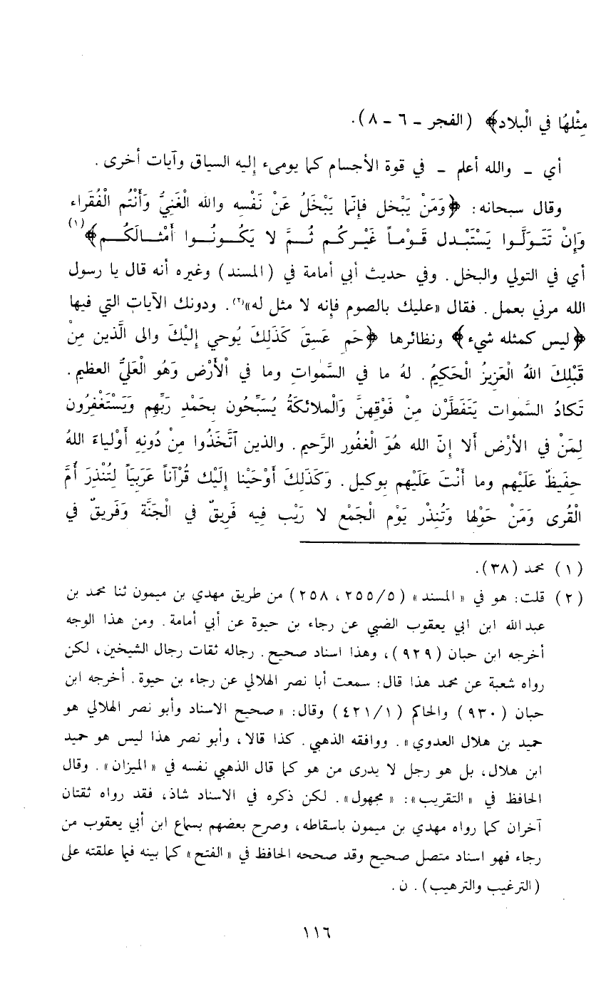 وقال سبحانه: «هَا أَنْتُمْ هَؤُلاءِ تُدْعَوْنَ لِتُنْفِقُوا فِي سَبِيلِ اللَّهِ فَمِنْكُمْ مَنْ يَبْخَلُ وَمَنْ يَبْخَلْ فَإِنَّمَا يَبْخَلُ عَنْ نَفْسِهِ وَاللَّهُ الْغَنِيُّ وَأَنْتُمُ الْفُقَرَاءُ وَإِنْ تَتَوَلَّوْا يَسْتَبْدِلْ قَوْماً غَيْرَكُمْ ثُمَّ لا يَكُونُوا أَمْثَالَكُمْ» خاتمة سورة (محمد) أي في الولي والبخل. وفي حديث أبي أمامة في (المسند) وغيره أنه قال يا رسول الله مرني بعمل. فقام: عليك بالصوم فإنه لا مثل له. (1) ودونك الآيات التي فيها (ليس كمثله شيء) ونظائرها «حم عسق. كَذَلِكَ يُوحِي إِلَيْكَ وَإِلَى الَّذِينَ مِنْ قَبْلِكَ اللَّهُ الْعَزِيزُ الْحَكِيمُ. لَهُ مَا فِي السَّمَاوَاتِ وَمَا فِي الْأَرْضِ وَهُوَ الْعَلِيُّ الْعَظِيمُ. تَكَادُ السَّمَاوَاتُ يَتَفَطَّرْنَ مِنْ فَوْقِهِنَّ وَالْمَلائِكَةُ يُسَبِّحُونَ بِحَمْدِ رَبِّهِمْ وَيَسْتَغْفِرُونَ لِمَنْ فِي الْأَرْضِ أَلا إِنَّ اللَّهَ هُوَ الْغَفُورُ الرَّحِيمُ. وَالَّذِينَ اتَّخَذُوا مِنْ دُونِهِ أَوْلِيَاءَ اللَّهُ حَفِيظٌ عَلَيْهِمْ وَمَا أَنْتَ عَلَيْهِمْ بِوَكِيلٍ. وَكَذَلِكَ أَوْحَيْنَا إِلَيْكَ قُرْآناً عَرَبِيّاً لِتُنْذِرَ أُمَّ الْقُرَى وَمَنْ حَوْلَهَا وَتُنْذِرَ يَوْمَ الْجَمْعِ لا رَيْبَ فِيهِ فَرِيقٌ فِي الْجَنَّةِ وَفَرِيقٌ فِي