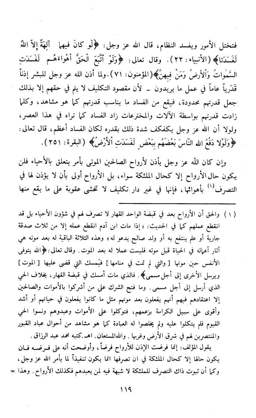 (1) والحق أن الأرواح بعد في قبضة الواحد القهار لا تصرف لهم في شؤون الأحياء بل قد انقطع عملهم كما في الحديث: «إذا مات أبن آدم انقطع عمله غلا من ثلاث صدقة جارية أو علم ينتفع به أو ولد صالح يدعوا له» وهذه الثلاثة الباقية له بعد موته في آثار أعماله في الحيات قبل موته فليست عملاً له بعد الموت. وقال تعالى: (اللَّهُ يَتَوَفَّى الْأَنْفُسَ حِينَ مَوْتِهَا «وَالَّتِي لَمْ تَمُتْ فِي مَنَامِهَا» فَيُمْسِكُ الَّتِي قَضَى عَلَيْهَا «الْمَوْتَ» وَيُرْسِلُ الْأُخْرَى إِلَى أَجَلٍ مُسَمّى) . فالذي مات أمسك في قبضة القهار، بخلاف الحي الذي أرسل إلى أجل مسمى. وما فتح الشرك على من أشركوا بالأموات والصالحين إلا اعتقادهم فيهم أنهم يفعلون بعد موتهم مثل ما كانوا يفعلون في حياتهم أو أشد وأقوى على سبيل الكرامة بزعمهم، فتوكلوا على الأموات وعبدوهم ونسوا الحي القيوم فلم يتكلموا عليه ولم يخلصوا له العبادة كما هو مشاهد من أحوال عباد القبور والمنتصرين لهم من شرق الأرض وغربها. والله المستعان كتبه محمد عبد الرزاق س.