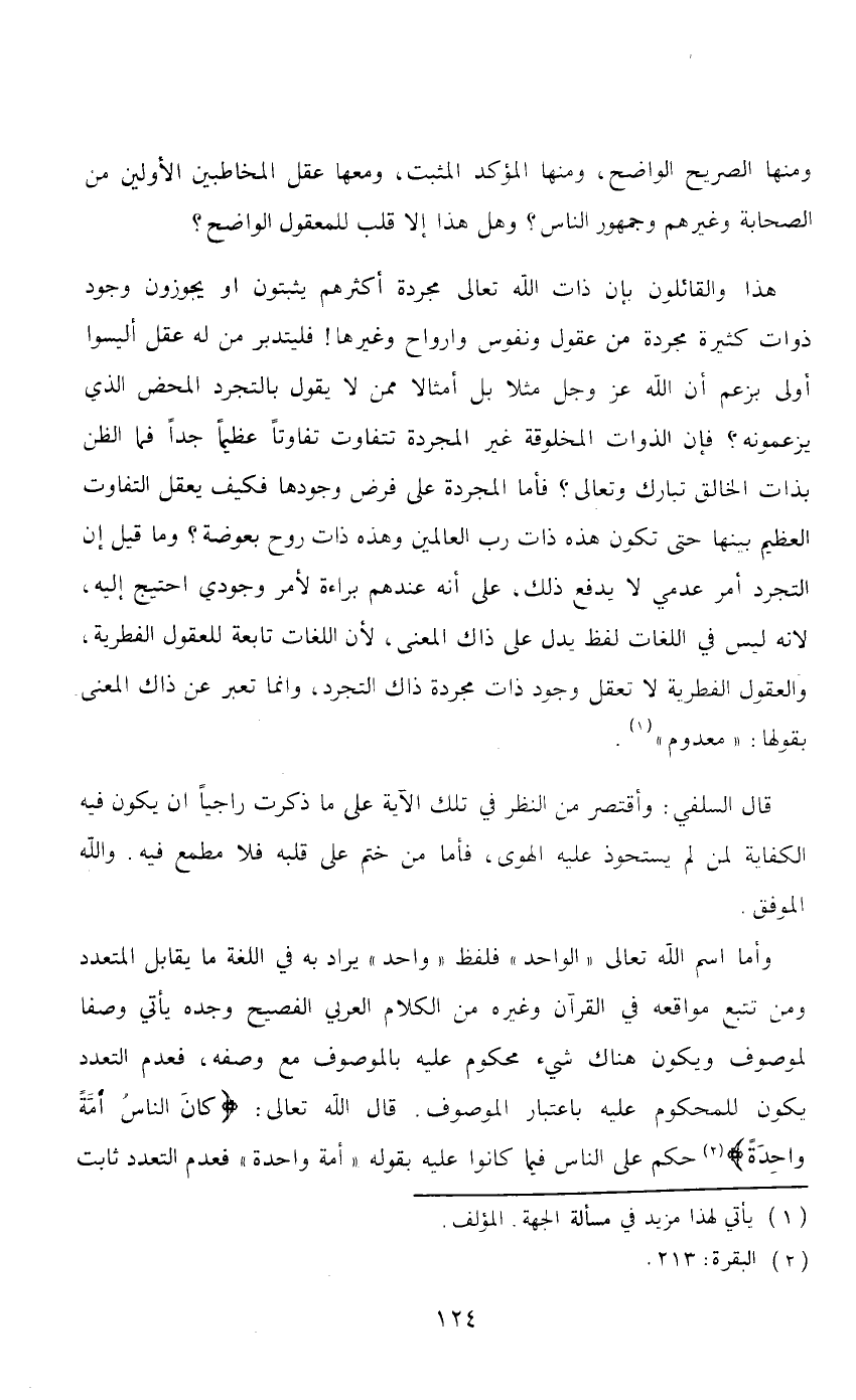 هذا والقائلون بأن ذات الله تعالى مجرداً أكثرهم يثبتون أو يجوزون وجود ذوات كثيرة مجردة من عقول ونفوس وأرواح غيرها! فليتدبر من له عقل أليسوا أولى بزعم أن لله عز وجل مثلاً بل أمثالاً ممن لا يقول بالتجرد المحض الذي يزعمونه؟ فإن الذوات المخلوقة غير المجردة تتفاوت تفاوتاً عظيماً جداً فما الظن بذات الخالق تبارك وتعالى؟ فأما المجردة على فرض وجودها فكيف يعقل التفاوت العظيم بينهما حتى تكون هذه ذات رب العالمين وهذه ذات روح بعوضة؟ وما قيل أن التجرد أمر عدمي لا يدفع ذلك، على أنه عندهم براءة لأمر وجودي احتيج إليه، لأنه ليس في اللغات لفظ يدل على ذاك المعنى، لأن اللغات تابعة للعقول الفطرية، والعقول الفطرية لا تعقل وجود ذات مجردة ذاك التجرد، وإنما تعبر عن ذاك المعنى بقولها: «معدوم» (1) .