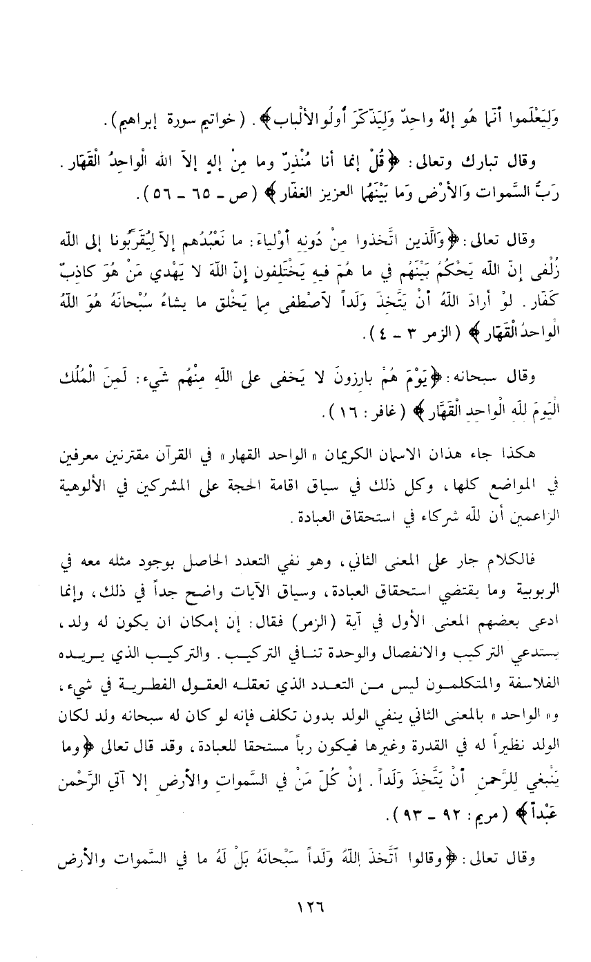 وقال تبارك وتعالى: «قُلْ إِنَّمَا أَنَا مُنْذِرٌ وَمَا مِنْ إِلَهٍ إِلَّا اللَّهُ الْوَاحِدُ الْقَهَّارُ. رَبُّ السَّمَاوَاتِ وَالْأَرْضِ وَمَا بَيْنَهُمَا الْعَزِيزُ الْغَفَّارُ» ص - 65 - 66.