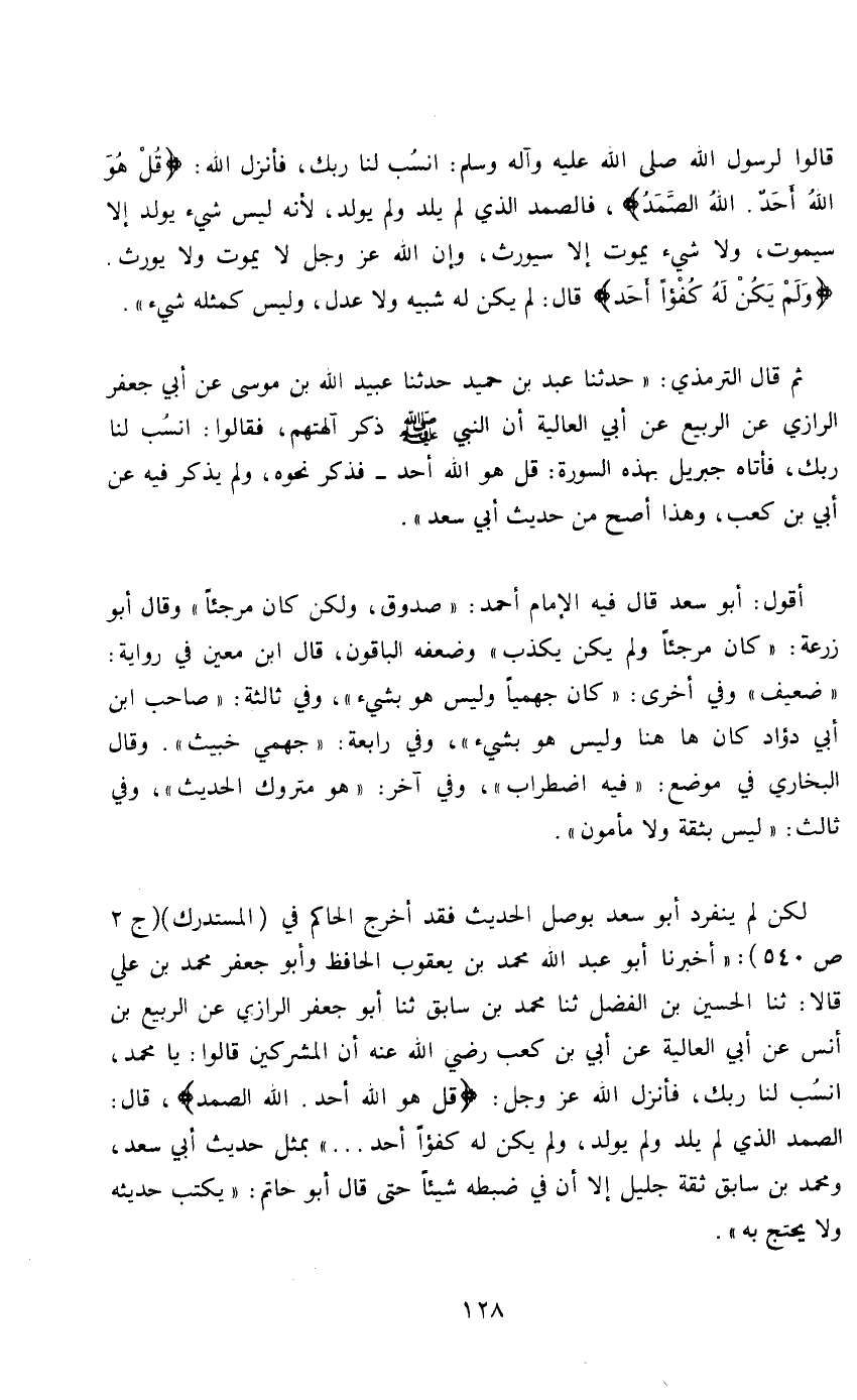 ثم قال الترمذي: «حدثنا بن حميد حدثنا عبيد الله بن موسى عن أبي جعفر الرزاي عن الربيع عن أبي العالية أن النبي - صلى الله عليه وسلم - ذكر آلهتهم، فقالوا: أنسُب لنا ربك، فأتاه جبريل بهذه السورة: قُلْ هُوَ اللَّهُ أَحَدٌ - فذكر نحوه، ولم يذكر فيه عن أبي بن كعب، وهذا أصح من حديث أبي سعد» .