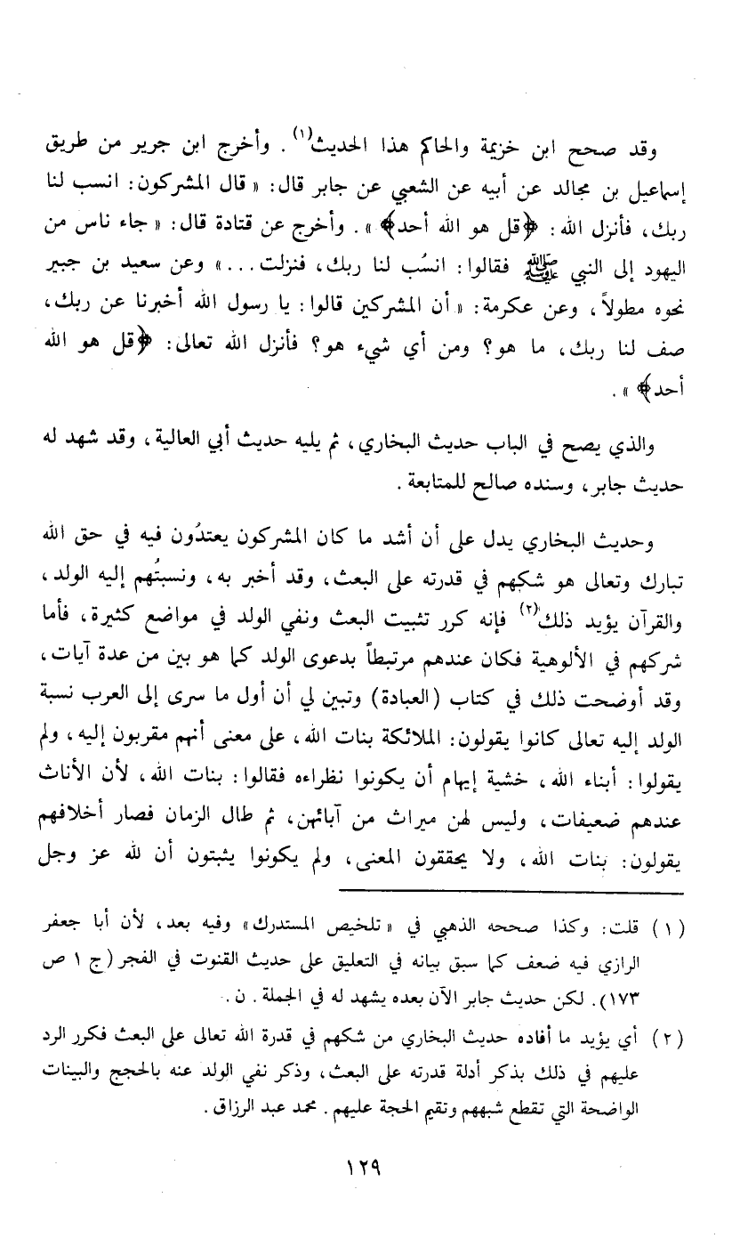 (2) أي يؤيد ما أقاده حديث البخاري من شكهم في قدرة الله تعالى على البعث فكرر الرد عليهم في ذلك بذكر أدلة قدرته على البعث، وذكر نفي الولد عنه بالحجج والبينات الواضحة التي تقطع شبههم وتقيم الحجة عليهم. محمد عبد الرزاق