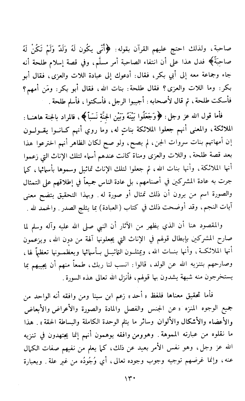 صاحبة، ولذلك يقولون: احتج عليهم القرآن بقوله: «أَنَّى يَكُونُ لَهُ وَلَدٌ وَلَمْ تَكُنْ لَهُ صَاحِبَةٌ» . فدل هذا على أن انتفاء الصاحبة أمر مسلم، وفي قصة إسلام طلحة أنه جاء وجماعة معه إلى أبي بكر، فقال: أدعوك إلى عبادة اللات والعزى، فقال أبو بكر: واللات والعزى؟ فقال طلحة: بنات الله، فقال أبو بكر: ومن أمهم؟ فأسكت طلحة، ثم قال لأصحابه: أجيبوا الرجل، فأسكتوا، فأسلم طلحة.