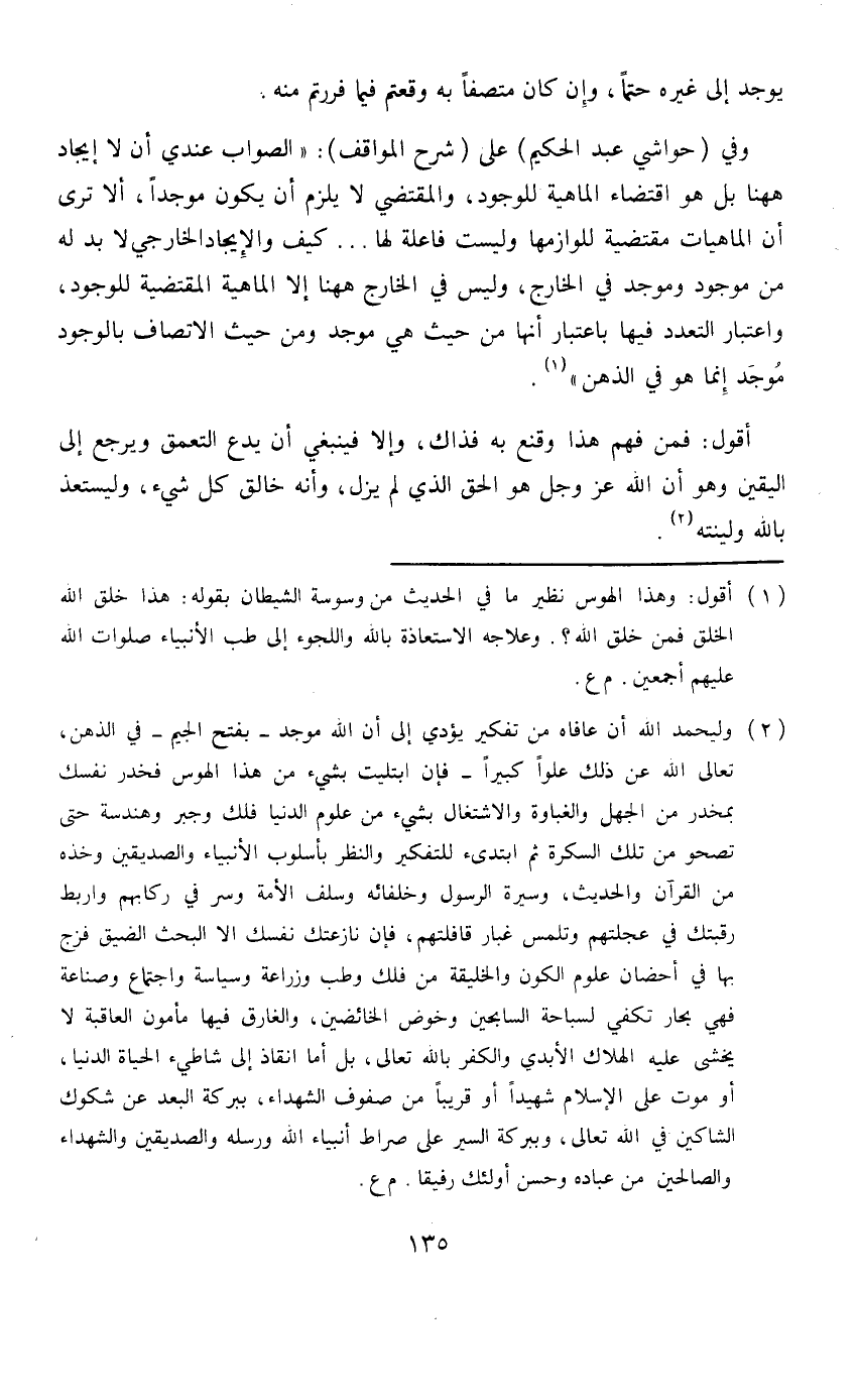 (2) وليحمد الله أن عافاه من تفكير يؤدي إلى أن الله موجد - بتفج الجيم - في الذهن، تعالى الله عن ذلك علواً كبيراً - فإن ابتليت من هذا الهو س فخدر نفسك من الجهل والغباوة والاشتغال بشيء من علوم الدنيا فلك وجبر وهندسة حتى تصحومن تلك السكرة ثم ابتدئ التفكير والنظر بأسلوب الأنبياء والصديقين وخذه من القرآن والحديث، وسيرة الرسول وخلفائه وسلف الأمة وسر في ركابهم واربط رقبتك في عجلتهم وتلمس غبار غبار قافلتهم، فإن نازعتك نفسك الا البحث الضيق فزج بها في أحضان علوم الكون والخليقة من فلك وطب وزراعة وسياسة واجتماع وصناعة فهي بحار تكفي لسباحة السابحين وخوض الخائضين، والغرق فيها مأمون العاقبة لا يخشى عليه الهلاك الأبدي والكفر بالله تعالى، بل أما انقاذ إلى شاطئ الحياة الدنيا، أو الموت على الإسلام شهيداً أو قريباً من صفوف الشهداء، ببركة البعد عن شكوك الشاكين في الله تعالى، وببركة السير على صراط أنبياء الله ورسله والصديقين والصالحين من عباده وحسن أولئك رفيقاً. م ع
