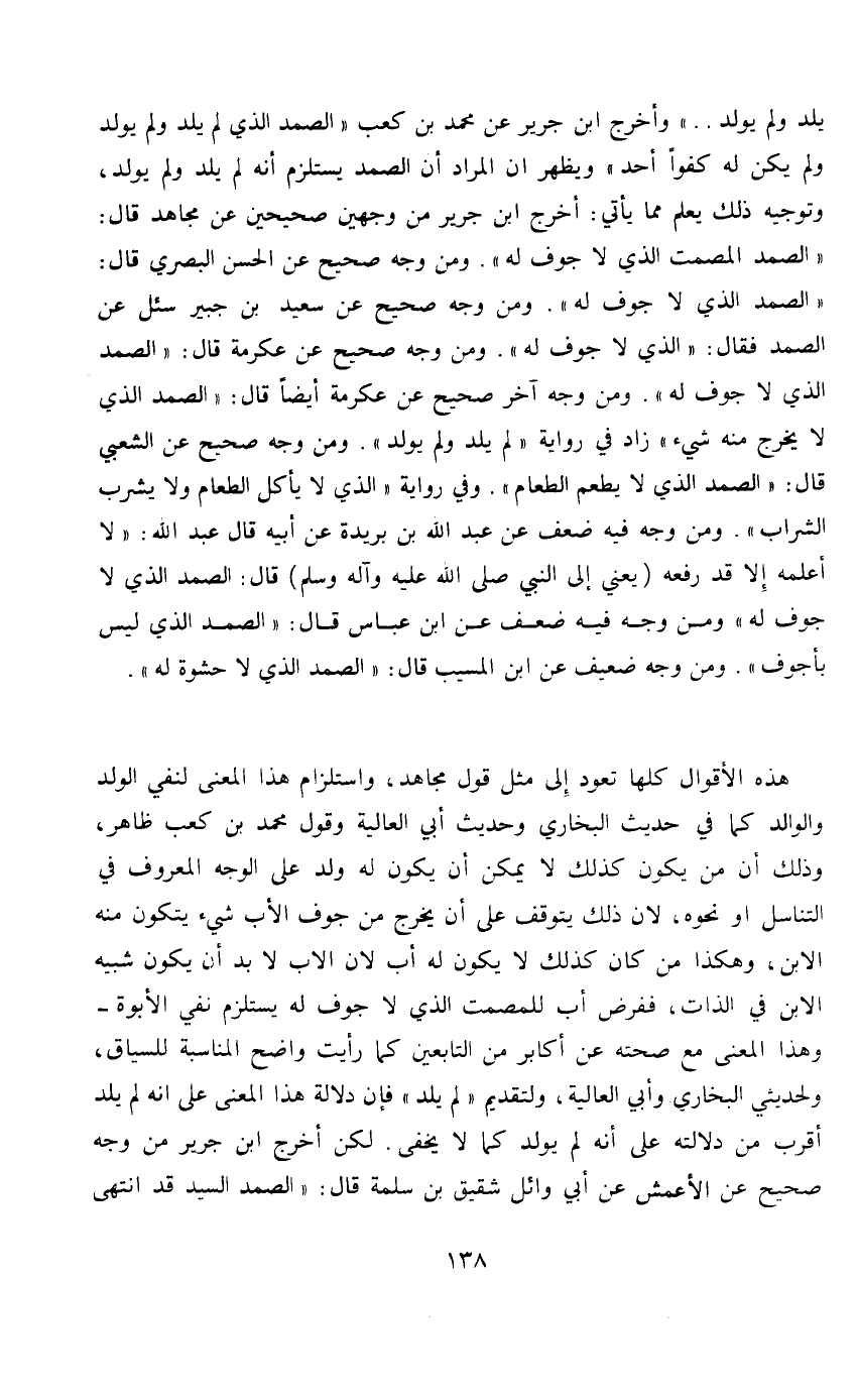 هذه الأقوال كلها تعود إلى مثل قول مجاهد، واستلزم هذا المعنى لنفي الولد والوالد كما في حديث البخاري وحديث أبي العالية وقول محمد بن كعب ظاهر، وذلك أن من يكون كذلك لا يمكن أن يكون له ولد على الوجه المعروف في التناسل أو نحوه، لأن ذلك يتوقف على أن يخرج من جوف الأب شيء يتكون منه الأب، وهكذا من كان كذلك لا يكون له أب لأن الأب لابد أن يكون شبيه الابن في الذات، ففرض أب للمصمت الذي لا جوف له يستلزم نفي الأبوة - وهذا المعنى مع صحته عن أكابر من التابعين كما رأيت واضح المناسبة للسياق، ولحديثي البخاري وأبي العالية، ولتقديم «لم يلد» فإن دلالة هذا المعنى على أنه لم يلد أقرب من دلالته على أنه لم يولد كما لا يخفى. لكن أخرج ابن جرير من وجه صحيح عن الأعمش عن أبي وائل شقيق بن سلمة قال: «الصمد السيد الذي قد انتهى