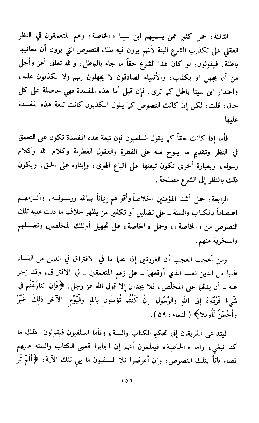 الثالثة: حمل كثير ممن يسميهم ابن سينا «الخاصة» وهم المتعمقون في النظر العقلي على تكذيب الشرع البتة لأنهم يرون فيه تلك النصوص التي يرون أن معانيها باطلة، فيقولون: لو كان هذا الشرع حقاً ما جاء بالباطل، والله تعالى أعز وأجل مكن أن يجل أو يكذب، والأنبياء الصادقون لا يجهلون ولا يكذبون عليه، واعتذار ابن سينا باطل كما ترى. فإن قيل أما هذم المفسدة فهي حاصلة على كل حال، قلت: لكن إن كانت النصوص كما يقول المكذبون كانت تبعة هذا المفسدة عليها.