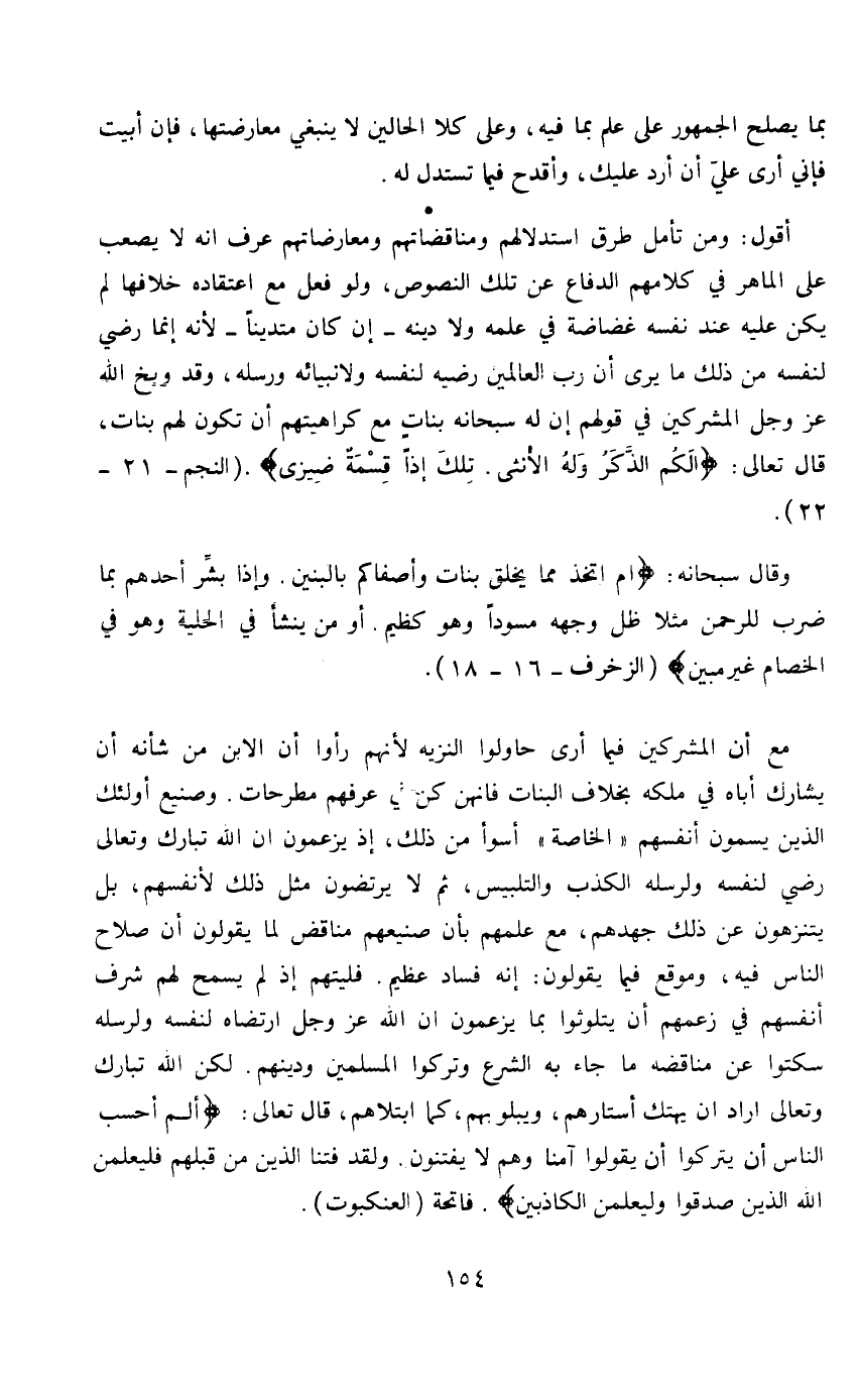 مع أن المشركين فيما أرى حاولوا التنزيه لأنهم رأو أن الابن من شأنه أن يشارك أباه في ملكه بخلاف البنات فإنهن كن في عرفهم مطرحات. وصنيع أولئك الذين يسمون أنفسهم «الخاصة» أسوأ من ذلك، إذ يزعمون أن الله تبارك وتعالى رضي لنفسه ولرسله الكذب والتلبيس، ثم لا يرتضون مثل ذلك لأنفسهم بل يتنزهون عن ذلك جهدهم، مع علمهم بأن صنيعهم مناقض لما يقولون أن صلاح الناس فيه وموقع فيما يقولون: إنه فساد عظيم. فليتهم إذ لم يسمح لهم شرف أنفسهم في زعمهم أن يتلوثوا بما يزعمون أن الله عز وجل ارتضاه لنفسه ولرسله سكتوا عن مناقضة ما جاء به الشرع وتركوا المسلمين ودينهم. لكن الله تبارك وتعالى أراد أن يهتك أستارهم، ويبلو بهم كما ابتلاهم، قال تعالى: «أَحَسِبَ النَّاسُ أَنْ يُتْرَكُوا أَنْ يَقُولُوا آمَنَّا وَهُمْ لا يُفْتَنُونَ (*) وَلَقَدْ فَتَنَّا الَّذِينَ مِنْ قَبْلِهِمْ فَلَيَعْلَمَنَّ اللَّهُ الَّذِينَ صَدَقُوا وَلَيَعْلَمَنَّ الْكَاذِبِينَ» . فاتحة (العنكبوت) .