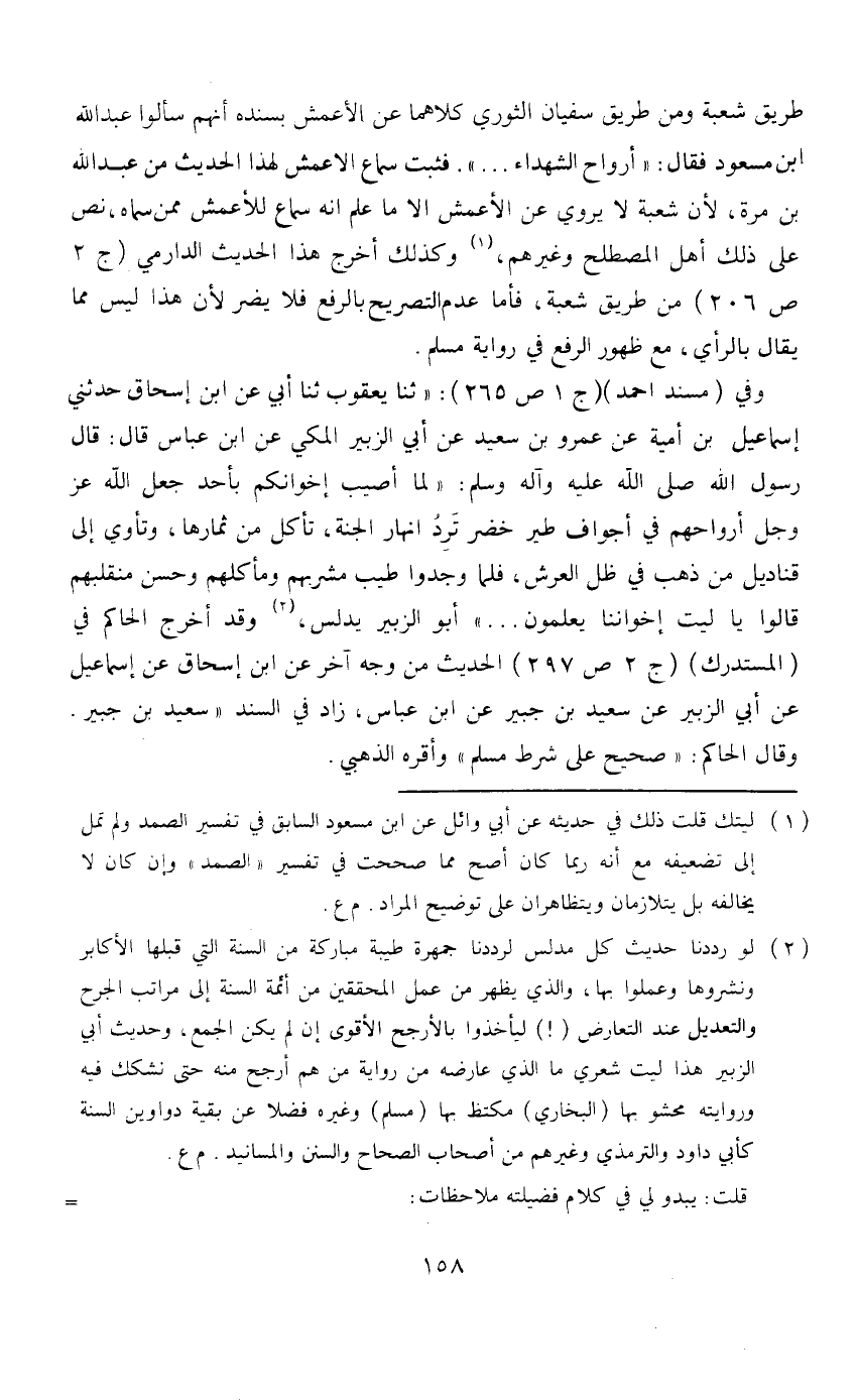 وفي (مسند أحمد) ج 1 ص 265، «ثنا يعقوب ثنا أبي إسحاق حدثني إسماعيل ابن أمية بن عمروا بن سعيد عن ابن الزبير المكي عن ابن عباس قال: قال رسول الله صلى الله عليه وآله وسلم: «لما أصيب إخوانكم بأحد جعل الله عز وجل أرواحهم في أجواف طير خضر تردد أنهار الجنة، تأكل من ثمارها، وتأو ي إلى قناديل من ذهب وظل العرش، فلما وجدوا طيب مشربهم ومأكلهم وحسن منقلبهم قالوا يا ليت إخواننا يعلمون ... » أبوالزبير يدلس، (2) وقد أخرج الحاكم في (المستدرك) ج 2 ص 297 الحديث من وجه آخر عن ابن إسحاق عن إسماعيل عن أبي الزبير عن سعيد بن جبير عن ابن عباس، زاد في السند «سعيد بن جبير. وقال الحاكم: «صحيح على شرط مسلم» وأقره الذهبي.