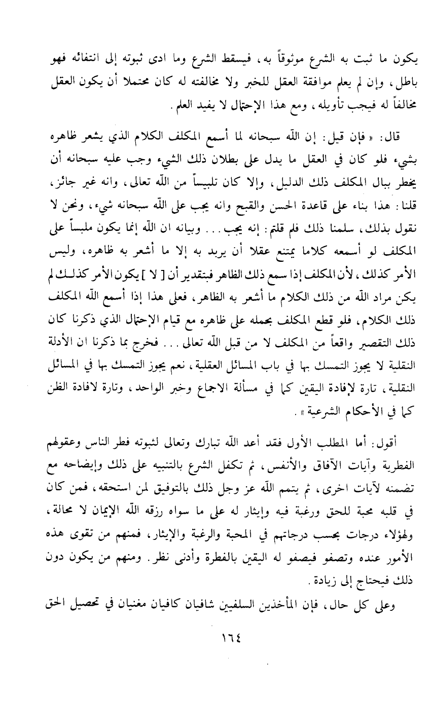 قال: «فإن قيل: إن الله سبحانه لما أسمع المكلف الكلام الذي يشعر ظاهره بشيء فلوكان في العقل ما يدل على بطلان ذلك الشيء وجب عليه سبحانه أن يخطر ببال المكلف ذلك الدليل، وإلا كان تلبيساً من الله تعالى، وإنه غير جائز، قلنا: هذا بناء على قاعدة الحسن والقبح وأنه يجب على سبحانه شيء، ونحن لا نقول بذلك، سلمنا ذلك فلم قلتم: إنه يجب ... ، وبيانه أن الله إنما يكون ملبساً على المكلف لوأسمعه كلاماً يمتنع عقلاً أن يريد به إلا ما أشعر به ظاهره، وليس الأمر كذلك، لأن المكلف إذا سمع ذلك الظاهر فبتقدير أن «لا» يكون الأمر كذلك لم يكن مراد الله من ذلك الكلام ما أشعر به الظاهر، فعلى هذا إذا أسمع الله المكلف ذلك الكلام، فلوقطع المكلف لحمله على ظاهره مع قيام الاحتمال الذي ذكرنا كان التقصير واقعاً من المكلف لا من قبل الله تعالى ...