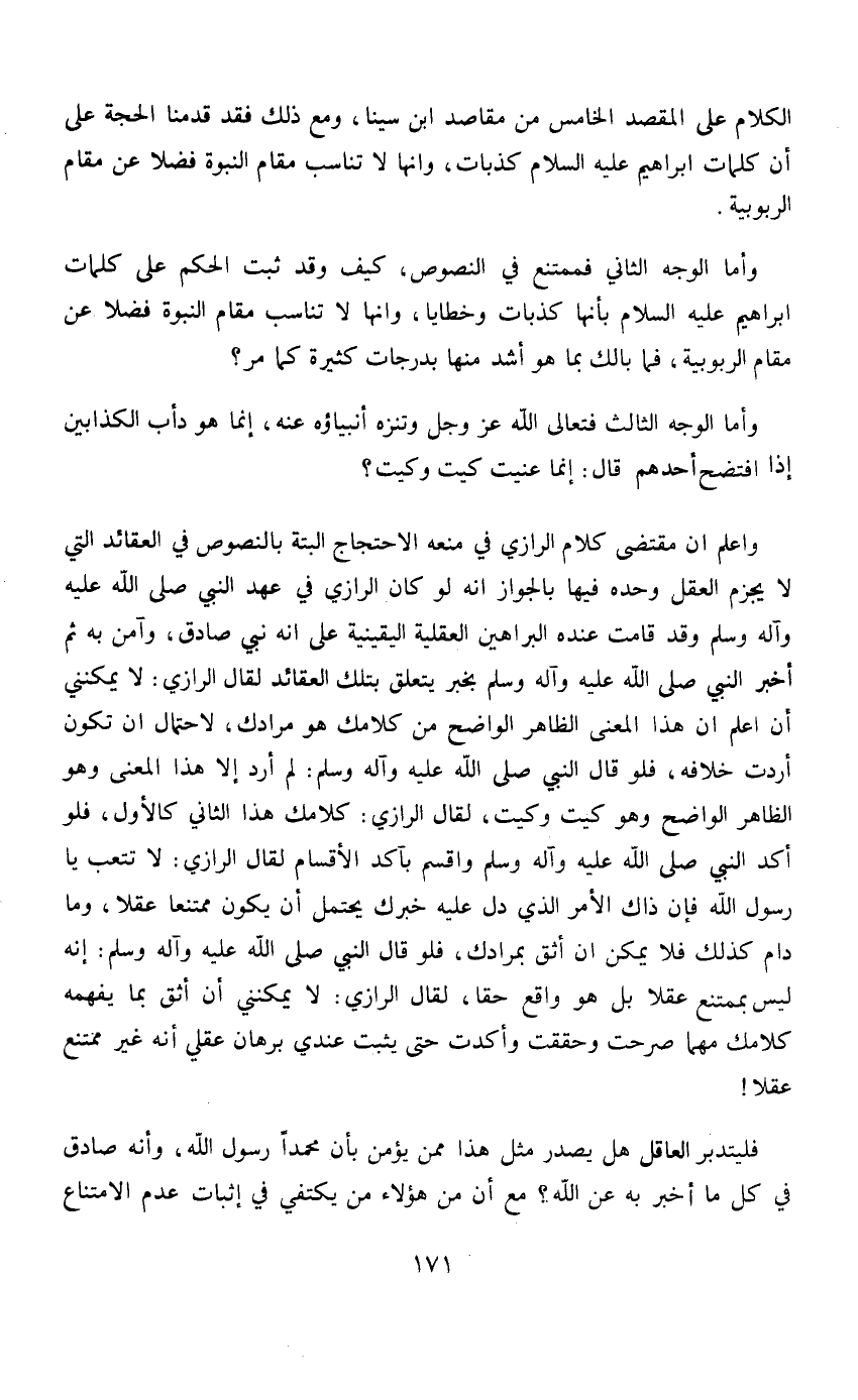 الكلام على المقصد الخامس من مقاصد ابن سينا، ومع ذلك فقد قدمناه الحجة على أن كلمات إبراهيم عليه السلام كذبات، وإنها لا تناسب مقام النبوة فضلاً عن مقام الربوبية.