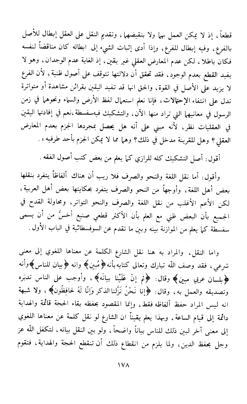 وأقول: أما نقل اللغة والنحووالصرف فلا ريب أن هناك ألفاظاً يتفرد بنقلها بعض أهل اللغة، وأوجهاً من النحووالصرف يتفرد بحكايتها بعض أهل العربية، لكن الأعم الأغلب من نقل اللغة والصرف والنحوالتواتر، ومحاولة القدح في الجميع بأن البعض ظني مع العلم بأن الأكثر قطعي صنيع أخس من أن يسمى سفسطة كما نعلم من الموازنة بينه وبين ما تقدم عن السوفسطائية في الباب الأول.