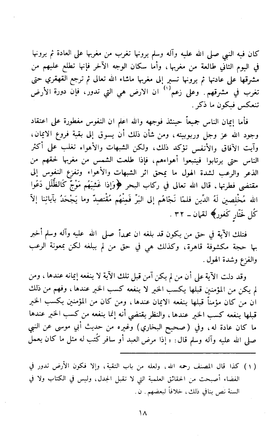 (1) كذا قول المصنف رحمه الله، ولعله من باب التقية، وإلا فكون الأرض تدور في الفضاء أصبحت من الحقائق العلمية التي لا تقبل الجدل، وليس في الكتاب ولا في السنة نص ينافي ذلك، خلافاً لبعضهم. ن