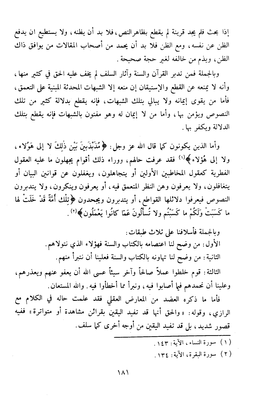 وأما الذين يكونون كما قال الله عز وجل: «مُذَبْذَبِينَ بَيْنَ ذَلِكَ لا إِلَى هَؤُلاءِ وَلا إِلَى هَؤُلاءِ» فقد عرفت حالهم، ووراء ذلك أقوام يجهلون ما عليه العقول الفطرية كعقول المخاطبين الأولين أو يتجاهلون، ويغفلون عن قوانين البيان أو يتغافلون، ولا يعرفون وهن النظر المتعمق فيه، أو يعرفون وينكرون، ولا يتدبرون النصوص فيعرفون دلائلها القواطع، أو يتدبرون ويجحدون «تِلْكَ أُمَّةٌ قَدْ خَلَتْ لَهَا مَا كَسَبَتْ وَلَكُمْ مَا كَسَبْتُمْ وَلا تُسْأَلونَ عَمَّا كَانُوا يَعْمَلُونَ» .