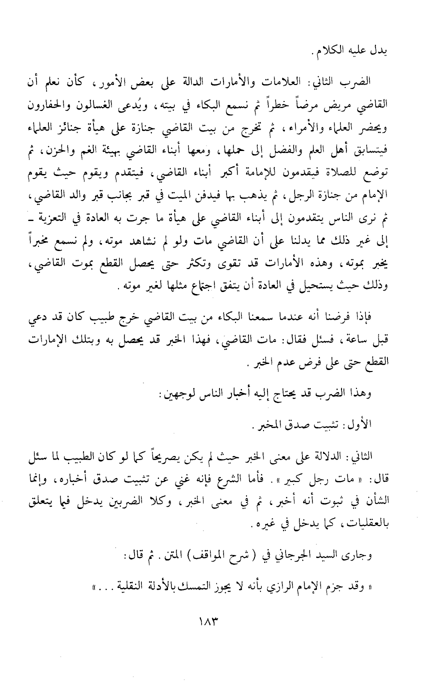 الثاني: الدلالة على معنى الخبر حيث لم يكن صريحاً كما لوكان الطبيب لما سئل قال: «مات رجل كبير» . فأما الشرع فإنه غني عن تثبيت صدق أخباره، وإنما الشأن في ثبوت أه أخبر، ثم في معنى الخبر، وكلا الضربين يدخل فيما يتعلق بالعقليات، كما يدخل في غيره.