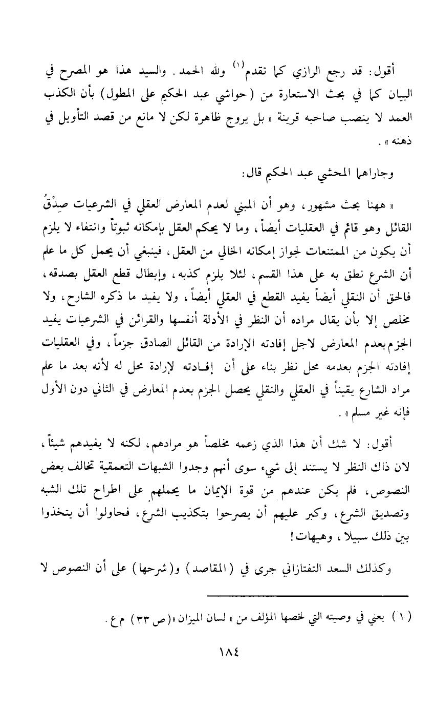 «ههنا بحث مشهور، وهو أن المبني لعدم المعارض العقلي في التشريعات صدقُ القائل، وهو قائم في العقليات أيضاً، وما لا يحكم العقل بإمكانه ثبوتاً وانتفاء لا يلزم أن يكون من الممتنعات لجواز إمكانه الخالي من العقل، فينبغي أن يحمل كل ما علم أن الشرع نطق به على هذا القسم، لئلا يلزم كذبه، وإبطال قطع العقل بصدقه، فالحق أن النقلي أيضاً يفيد القطع في العقلي أيضاً، ولا يفيد ما ذكره الشارح، ولا مخلص إلا بأن يقال مراده أن النظر في الأدلة أنفسها والقرآئن في الشرعيات يفيد الجزم بعد المعارض لأجل إفادته الإرادة من القائل الصادق جزما، وفي العقليات إفادته الجزم بعدمه محل نظر بناء على إفادته لإرادة محل له لأنه بعد ما علم مراد الشارع يقيناً في العقلي والنقلي يحصل الجزم بعدم المعارض في الثاني دون الأول فإنه غير مسلم» .
