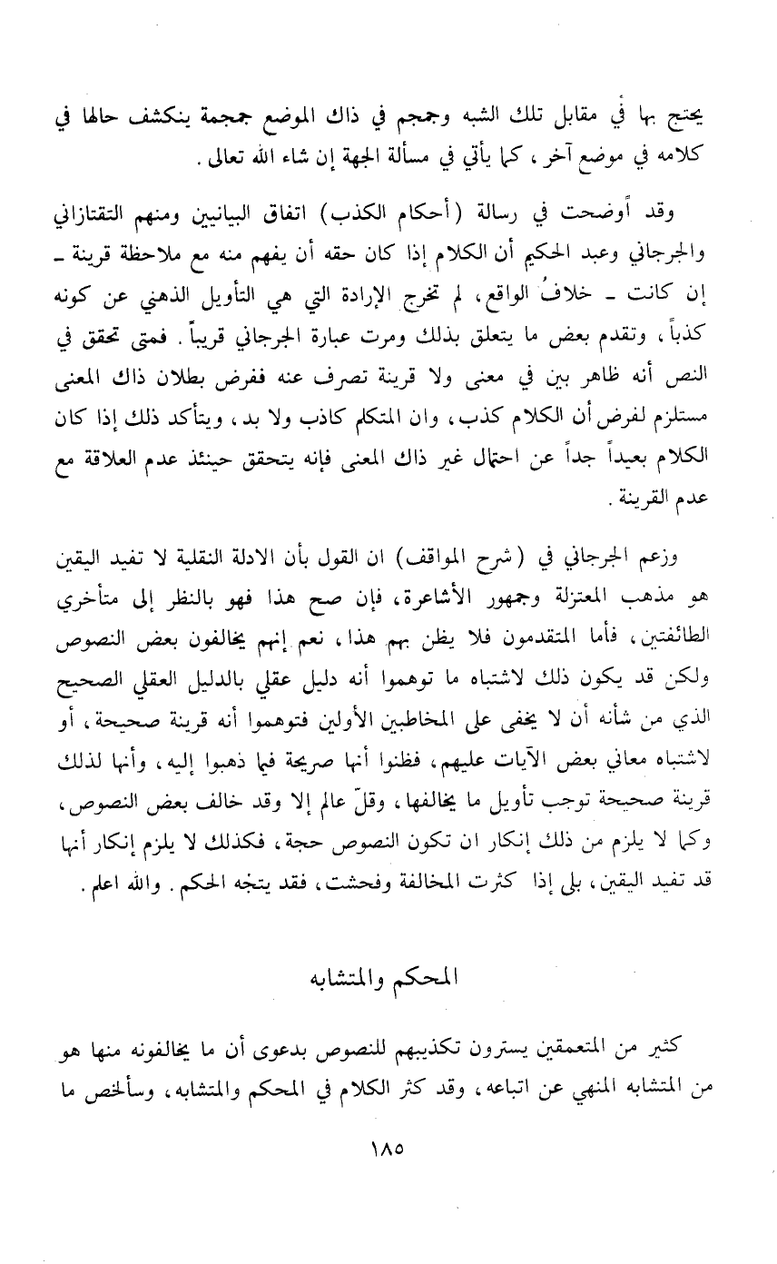 وزعم الجرجاني في (شرح المواقف) أن القول بأن الأدلة لا تفيد اليقين هو مذهب المعتزلة وجمهور الأشاعرة، فإن صح هذا القول فهو بالنظر إلى متأخري الطائفتين، فأما المتقدمون فلا يظن بهم هذا، نعم إنهم يخالفون بعض النصوص ولكن قد يكون ذلك لاشتباه ما توهموا أنه دليل عقلي بالدليل العقلي الصحيح الذي من شأنه أن لا يخفى على المخاطبين الأولين فتوهموا أنه قرينة صحيحة، أولاشتباه معاني بعض الآيات عليهم، فظنوا أنها صريحة