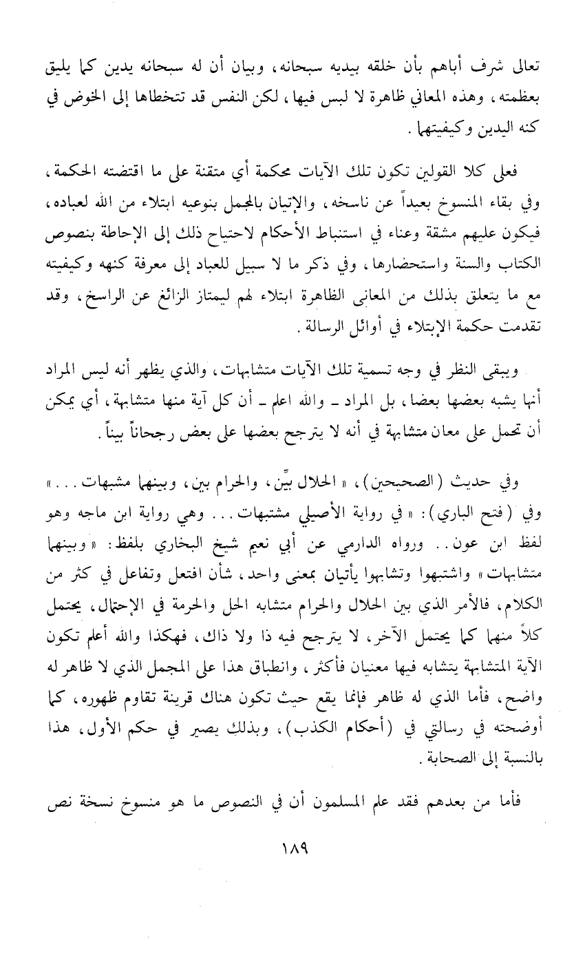 وفي حديث (الصحيحين) : «الحلال بين، والحرام بين، وبينهما مشبهات ... » وفي (فتح الباري) : «وفي رواية الأصيلي مشتبهات ... وهي رواية ابن ماجه وهو لفظ ابن عون ... ورواه الدارمي عن أبي نعيم شيخ البخاري بلفظ: «وبينهما متشابهات» واشتبهو اوتشابهو ايأتيان بمعنى واحد، شأن افتعل وتفاعل في كثير من الكلام، فالأمر الذي بين الحلال والحرام متشابه الحل والحرمة في الاحتمال، يحتمل كلاً منهما كما يحتمل الآخر، لا يترجح فيه ذا ولا ذاك، فهكذا والله أعلم تكون الآية المتشابهة يتشابه فيها معنيان فأكثر، وانطباق هذا على المجمل الذي ظاهر له واضح، فأما الذي له ظاهر فإنما يقع حيث تكون هناك قرينة تقاوم ظهوره، كما أوضحته في رسالتي في (أحكام الكذب) ، وبذلك يصير في حكم الأول، هذا بالنسبة إلى الصحابة.