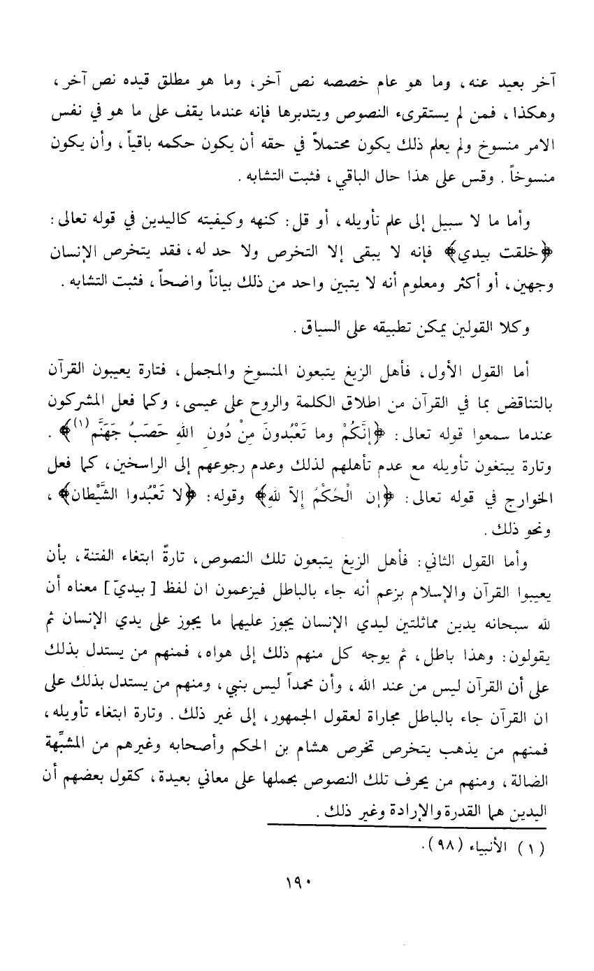 وأما القول الثاني: فأهل الزيغ يتبعون تلك النصوص، تارة ابتغاء الفتنة، بأن يعيبوا القرآن والإسلام بزعم أنه جاء بالباطل فيزعمون أن لفظ «بِيَدَيّ» معناه أن لله سبحانه يدين مماثلتين ليدي الإنسان يجوز عليهما ما يجوز على يدي الإنسان ثم يقولون: وهذا باطل، ثم يوجه كل منهم ذلك إلى هواه، فنمهم من يستدل بذلك على أن القرآن ليس من عند الله، وأن محمداً ليس بنبي، ومنهم من يستدل بذلك على أن القرآن جاء بالبطل مجاراة لعقول الجمهور، إلى غير ذلك. وتارة ابتغاء تأويله، فمنهم من ذهب يتخرص تخرص هشام بن الحكم وأصحابه وغيرهم من المشبهة الضالة، ومنهم من يحرف تلك النصوص بحملها على معاني بعيدة، كعقول بعضهم أن اليدين هما القدرة والإرادة وغير ذلك.