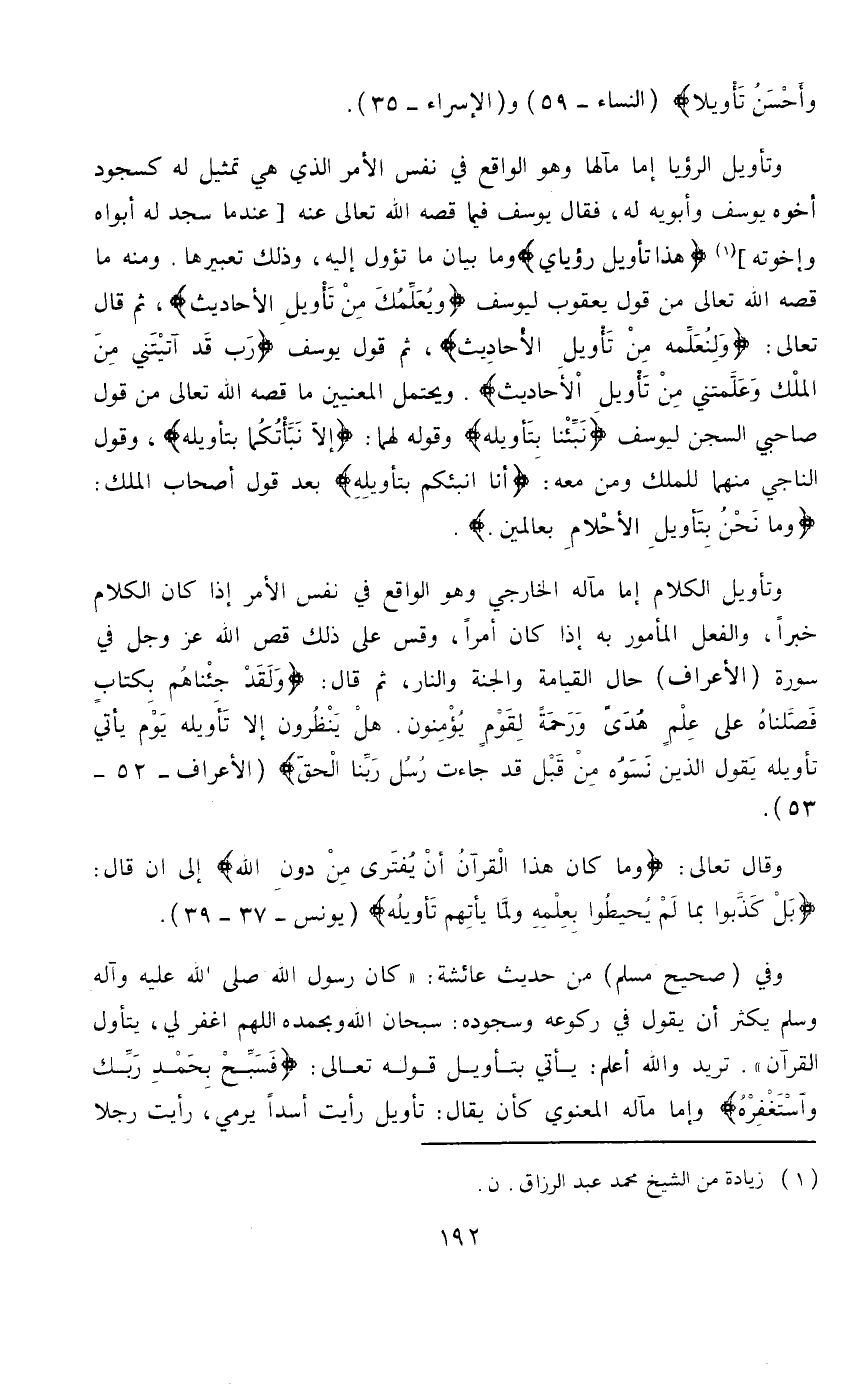 وتأويل الرؤيا إما مآلها وهو الواقع في نفس الأمر الذي هي تمثيل له كسجود إخوة يوسف وأبويه له، فقال يوسف قصة الله تعالى عنه «عندما سجد له أبواه وإخوته] (3) هذا تأويل رؤياي، وإما بيان ما تؤول إليه، وذلك تعبيرها. ومنه ما قصه الله تعالى من قول يعقوب ليوسف «وَيُعَلِّمُكَ مِنْ تَأْوِيلِ الْأَحَادِيث» ، ثم قول يوسف «رَبِّ قَدْ آتَيْتَنِي مِنَ الْمُلْكِ وَعَلَّمْتَنِي مِنْ تَأْوِيلِ الْأَحَادِيثِ» . ويحتمل المعنيين ما قصه الله تعالى من قول صحأبي السجن ليوسف «نبأنا بتأويله» وقوله لهما: «إلا نبأتكما بتأويله» ، وقول الناجي منها للملك ومن معه «أنا أنبئكم بتأويله» بعد قوأصحاب الملك «وما نحن بتأويل الأحلام بعالمين» .