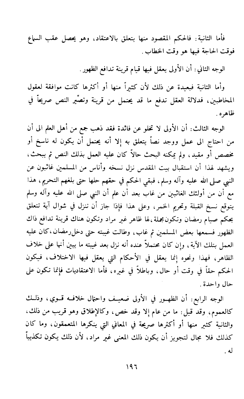 الوجه الثالث: أن الأولى لا تخلوفائدة فقد ذهب حمع من أهل العلم إلى أن من احتاج إلى عمل ووجد نصاً يتعلق به إلا أنه يحتمل أن يكون له ناسخ أو مخصص أو مقيد، ولم يمكنه البحث حالاً كان عليه العمل بذلك النص ثم يبحث، ويشهد لهذا أن استقبال بين بيت المقدس نزل نسخه وأناس من المسلمين غائبون عن النبي صلى الله عليه وآله وسلم، فبقي الحكم في حقهم استقبال بيت المقدس حتى بلغهم النسخ، وكذلك تحريم الخمر نزل وأناس من المسلمين غائبون، فبقي الحكم في حقهم حلها حتى بلغهم التحريم، هذا مع أن من أولئك الغائبين من غاب بعد أن علم أن النبي صلى الله عليه وآله وسلم يتوقع القبلة وتحريم الخمر، وعلى هذا فإذا جاز أن تنزل في شوال آية تتعلق بحكم رمضان وتكون مجملة لها ظاهر غير مراد وتكون هناك قرينة تدافع ذاك الظهور فسمعها بعض المسلمين ثم غاب، وطالت غيبته حتى دخل رمضان كان عليه العمل بتلك الآية، وإن كان محتملاً عنده نزل بع غيبة ما يبين أنها على خلاف الظاهر، فهذا ونحوه إنما يعقل في الأحكام التي يعقل فيها الاختلاف، فيكون الحكم حقاً في وقت أو حال، وباطلاً في غيره، فأما الاعتقادات فإنما تكون على حال واحدة.