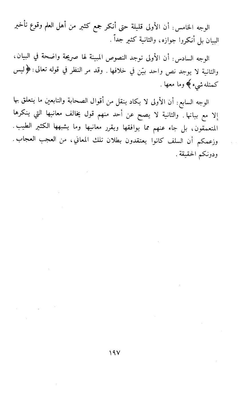 الوجه السادس: أن الأولى توجد النصوص المبينة لها صريحة واضحة في البيان، والثانية لا يوجد نص واحد بين في خلافها. وقد مر النظر في قوله تعالى: «ليس كمثله شيء» وما معها.