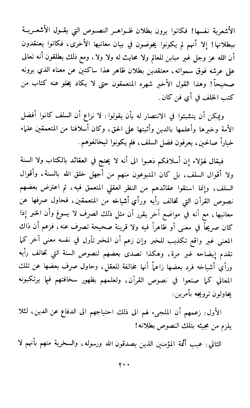 الأشعرية نفسها! فكانوا يرون بطلان ظواهر النصوص التي يقول الأشعرية ببطلانها! إلا أنهم لم يكونوا يخوضون في بيان معانيها الأخرى، فكانوا يعتقدون أن الله عز وجل غير مباين للعالم ولا محايث له ولا ولا، ومع ذلك أنهم يطلقون أنه تعالى على عرشه فوق سماواته، معتقدين بطلان ظاهر هذا ساكتين عن معناه الذي يرونه صحيحاً! وهذا القول الأخير شهره المتعمقون حتى لا يكاد يخلوا عنه كتاب من كتب الخلف في أي فن كان.