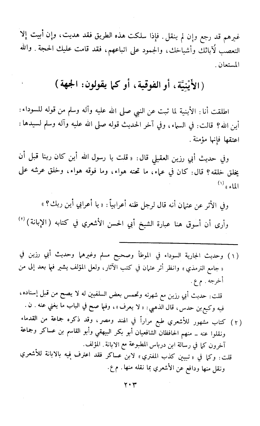 (1) وحديث الجارية السوداء في الموطأ وصحيح مسل وغيرهما وحديث أبي رزين في «جامع الترمذي» وانظر أثر عثمان في كتب الآثار، ولعل المؤلف يشير فيما بعد إلى من أخرجه. م ع