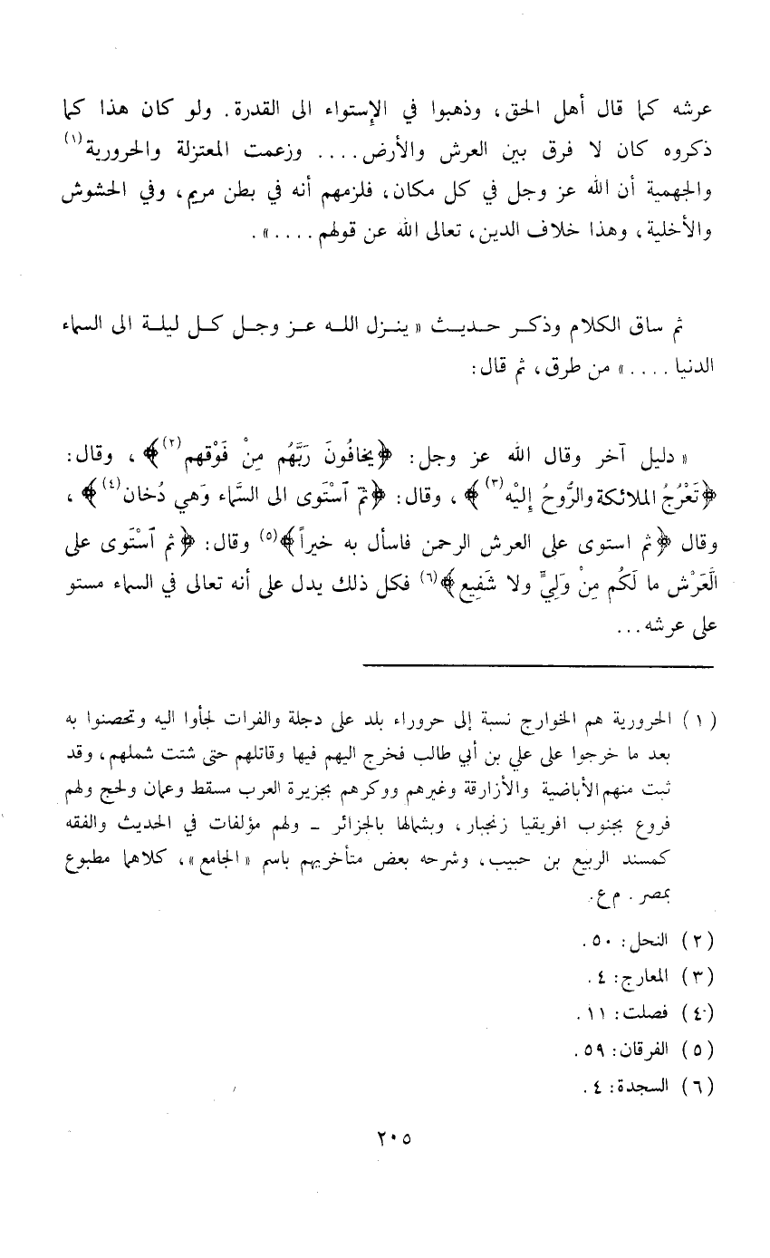 (دليل آخر) : وقال الله عز وجل: «يَخَافُونَ رَبَّهُمْ مِنْ فَوْقِهِمْ» ، وقال «تَعْرُجُ الْمَلائِكَةُ وَالرُّوحُ إِلَيْه» ، وقال: «ثُمَّ اسْتَوَى إِلَى السَّمَاءِ وَهِيَ دُخَانٌ» ، وقال: «ثُمَّ اسْتَوَى عَلَى الْعَرْشِ الرَّحْمَنُ فَاسْأَلْ بِهِ خَبِيراً» ، وقال: «ثُمَّ اسْتَوَى عَلَى الْعَرْشِ مَا لَكُمْ مِنْ دُونِهِ مِنْ وَلِيٍّ وَلا شَفِيعٍ» فكل ذلك يدل على أنه تعالى في السماء مستو على عرشه ...