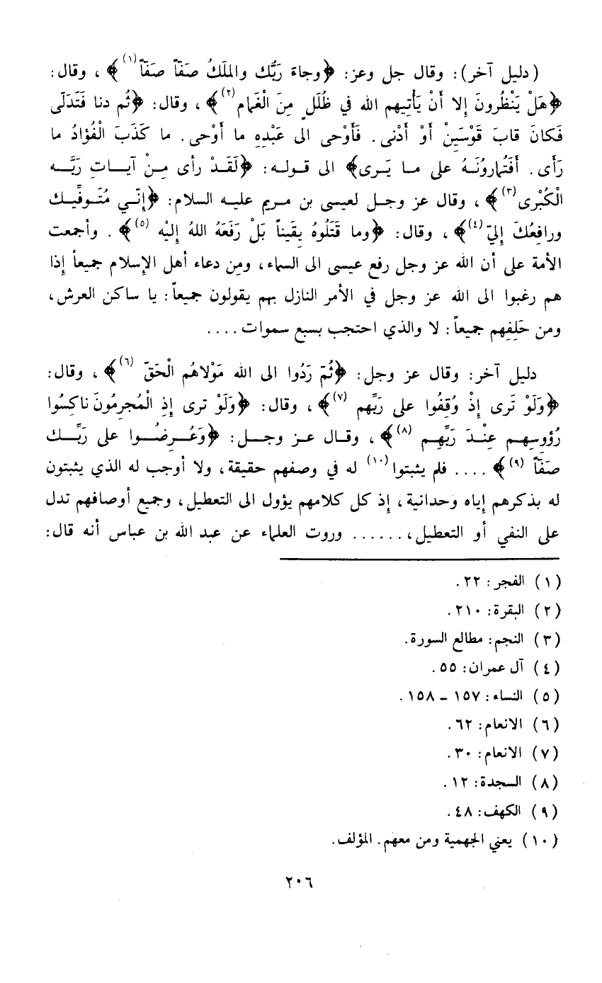 دليل آخر: وقال عز وجل: «ثُمَّ رُدُّوا إِلَى اللَّهِ مَوْلاهُمُ الْحَقِّ» ، وقال «وَلَوْ تَرَى إِذْ وُقِفُوا عَلَى رَبِّهِم» ، وقال «وَلَوْ تَرَى إِذِ الْمُجْرِمُونَ نَاكِسُورُؤُوسِهِمْ عِنْدَ رَبِّهِمْ» ، وقال عز وجل: «وَعُرِضُوا عَلَى رَبِّكَ صَفّا» ... فلم يثبتوا (1) له في وصفهم حقيقة، ولا أو جب له الذي يثبتون له بذكرهم إياه وحدانية، إذ كل كلامهم يؤول إلى التعطيل، وجميع أو صافهم تدل على النفي أو التعطيل، ... وروت العلماء عن عبد الله بن عباس أنه قال: