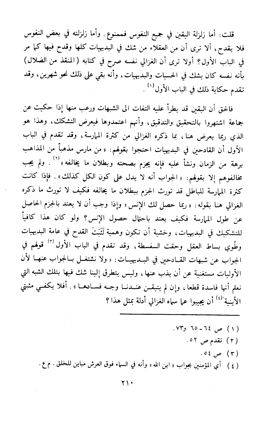قلت: أما زلزلة اليقين في جميع النفوس فممنوع. وأما زلزلته في بعض النصوص فلا يقدح، ألا ترى أن من العقلاء من شك في البديهيات كلها وقدح فيها كما مر في الباب الأول؟ أولا ترى أن الغزالي نفسه صرح في كتابه (المنقذ من الضلال) بأنه نفسه كان يشك في الحسيات والبديهيات، وأنه بقي على ذلك نحو شهرين، وقد تقدم حكاية ذلك في الباب الأول (1) .