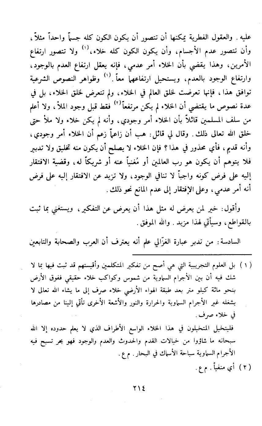 (1) بل العلوم التجريبية التي هي أصح من تفكير المتكلمين وأقيستهم قد ثبت فيها بما لا شك فيه أن بين الأجرام السماوية من شموس وكواكب خلاء حقيقي ففوق الأرض بنحومائة كيلومتر بعد طبقة الهو اء الأرضي خلاء صرف إلى ما يشاء الله تعالى لا يشغله غير الأجرام السماوية والحرارة والنور والأشعة الأخرى تأتي إلينا من مصادرها في خلاء صرف.