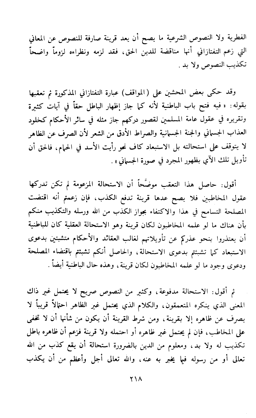 ثم أقول: الاستحالة مدفوعة، وكثير من النصوص صريح لا يحتمل غير ذاك المعنى الذي ينكره المتعمقون، والكلام الذي غير الظاهر احتمالاً قريباً لا يصرف عن ظاهر إلا بقرينة، ومن شرط القرينة أن يكون من شأنها أن لا تخفى على المخاطب، فإن لم يتحمل غير ظاهره أو احتمله ولا قرينة فزعم أن ظاهره باطل تكذيب له ولابد، ومعلوم من الدين بالضرورة استحالة أن يقع كذب من الله تعالى أو من رسوله فيما يخبر به عنه، والله تعالى أجل وأعظم من أن يكذب