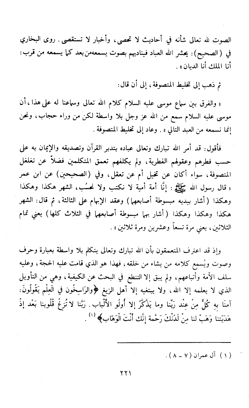 فأقول: قد مر الله تبارك وتعالى عباده بتدبر القرآن وتصديقه والإيمان به على حسب فطرهم وعقولهم الفطرية، ولم يكلفهم تعمق المتكلمين فضلاً عن تغلغل المتصوفة، سواء أكان عن تخيل أم عن تعقل، وفي (الصحيحين) عن ابن عمر «قال رسول الله - صلى الله عليه وسلم -: إنا أمة أمية لا نكتب ولا نحسب، الشهر هكذا وهكذا (أشار بيديه مبسوطة أصابعهما) وعقد الإبهام على الثالثة، ثم قال: الشهر هكذا وهكذا وهكذا (أشار بها مبسوطة أصابعهما في الثلاث كلها) يعني تمام الثلاثين يعني تسعة وعشرين مرة ثلاثين» .