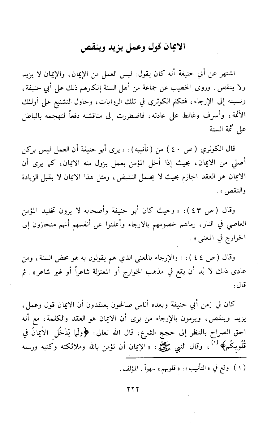 قال الكوثري ص 40 من (تأنيبه) : «يرى أبوحنيفة أن العمل ليس بركن أصلي من الإيمان، بحيث إذا أخل المؤمن بعمل يزول منه الإيمان، كما يرى أن الإيمان هو العقد الجازم بحيث لا يحتمل النقيض، ومثل هذا الإيمان لا يقبل الزيادة والنقص» .