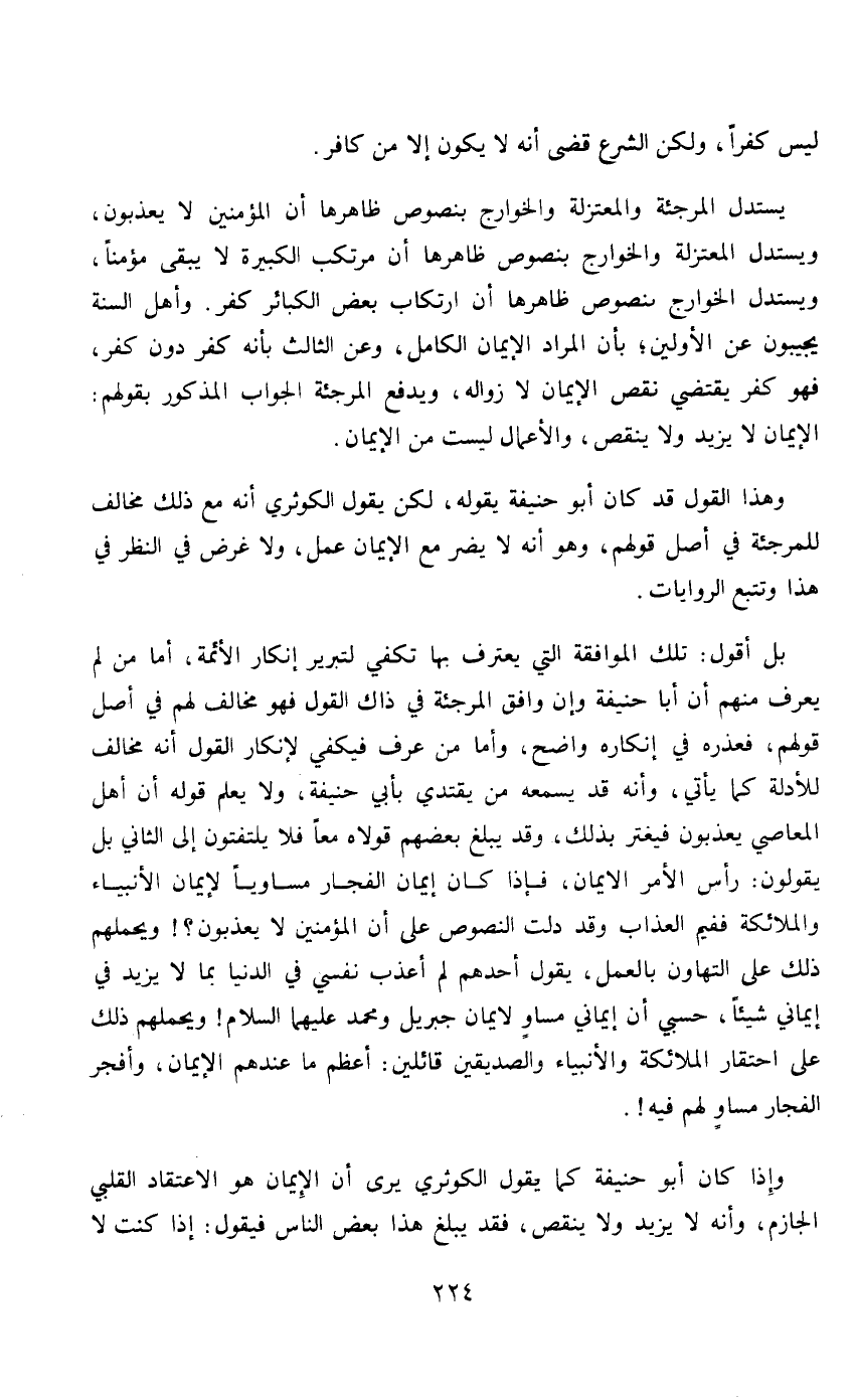 وهذا القول قد كان أبوحنيفة يقوله، لكن يقول الكوثري أنه مع ذلك مخالف للمرجئة في أصل قولهم، وهو أنه لا يضر مع الإيمان، ولا غرض في النظر في هذا وتتبع الروايات.