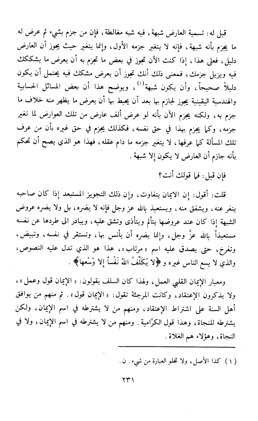 قلت: أقول: إن الإيمان يتفاوت، وإن ذلك التجويز المستعبد إذا كان صاحبه ينفر عنه، ويشفق منه، ويستعيذ بالله عز وجل فإنه لا يضر، بل ولا يضره عروض الشبهة إذا كان عند عروضها يتألم ويتأذى وتشق عليه، ويبادر إلى طردها عن نفسه مستعيذاً بالله عز وجل، وإنما يضره أن يأنس بها، وتستقر في نفسه، وتبيض، وتفرخ، حتى يصدق عليه اسم «مرتاب» هذا هو تدل عليه النصوص، والذي لا يسع الناس غيره و «لا يكلف الله نفساً إلا وسعها» .