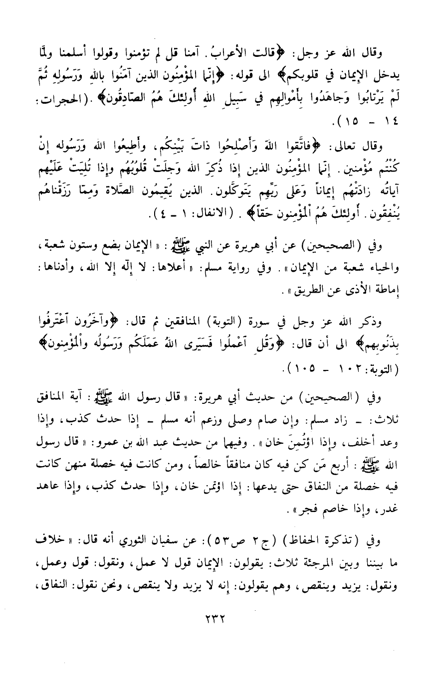 وقال الله عز وجل: «قَالَتِ الْأَعْرَابُ آمَنَّا قُلْ لَمْ تُؤْمِنُوا وَلَكِنْ قُولُوا أَسْلَمْنَا وَلَمَّا يَدْخُلِ الْأِيمَانُ فِي قُلُوبِكُمْ» إلى قوله: «إِنَّمَا الْمُؤْمِنُونَ الَّذِينَ آمَنُوا بِاللَّهِ وَرَسُولِهِ ثُمَّ لَمْ يَرْتَابُوا وَجَاهَدُوا بِأَمْوَالِهِمْ وَأَنْفُسِهِمْ فِي سَبِيلِ اللَّهِ أُولَئِكَ هُمُ الصَّادِقُونَ» الحجرات: 14 - 15