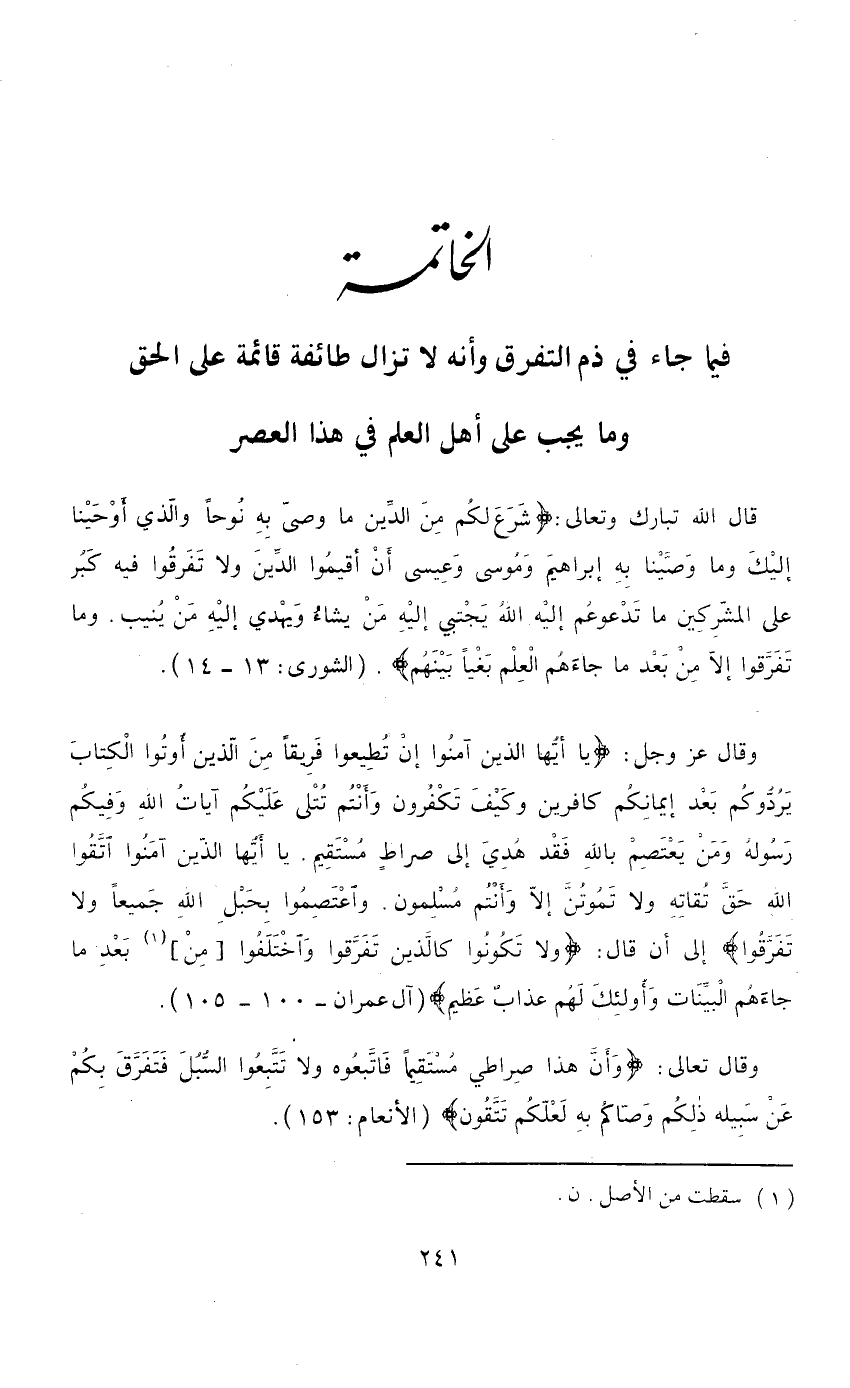 الخاتمة: فيما جاء في ذم التفرق وأنه لا تزال طائفة قائمة على الحق وما يجب على أهل العلم في هذا العصر