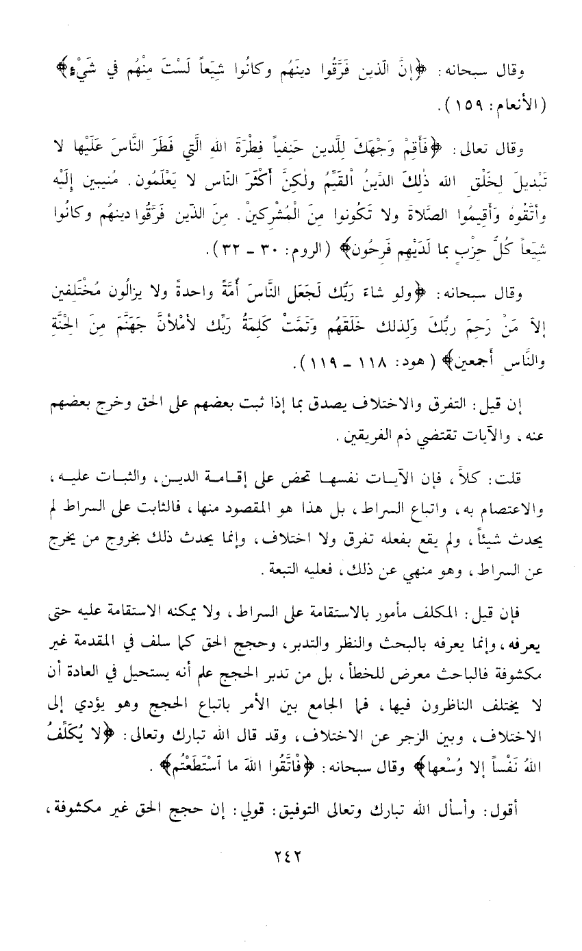 فإن قيل: المكلف مأمور بالاستقامة على الصراط، ولا يمكنه الاستقامة عليه حتى يعرفه، وإنما يعرفه بالبحث والنظر والتدبير، وحجج الحق كما سلف في المقدمة غير مكشوفة فالباحث معروف للخطأ، بل متدبر الحجج علم أنه يستحيل في العادة أن لا يخلف الناظرون فيها، فما الجامع بين الأمر باتباع الحجج وهو يؤدي إلى الاختلاف، وبين الزجر عن الاختلاف، وقد قال الله تبارك وتعالى: «لَا يُكَلِّفُ اللَّهُ نَفْسًا إِلَّا وُسْعَهَا» وقال سبحانه: «فَاتَّقُوا اللَّهَ مَا اسْتَطَعْتُمْ» .