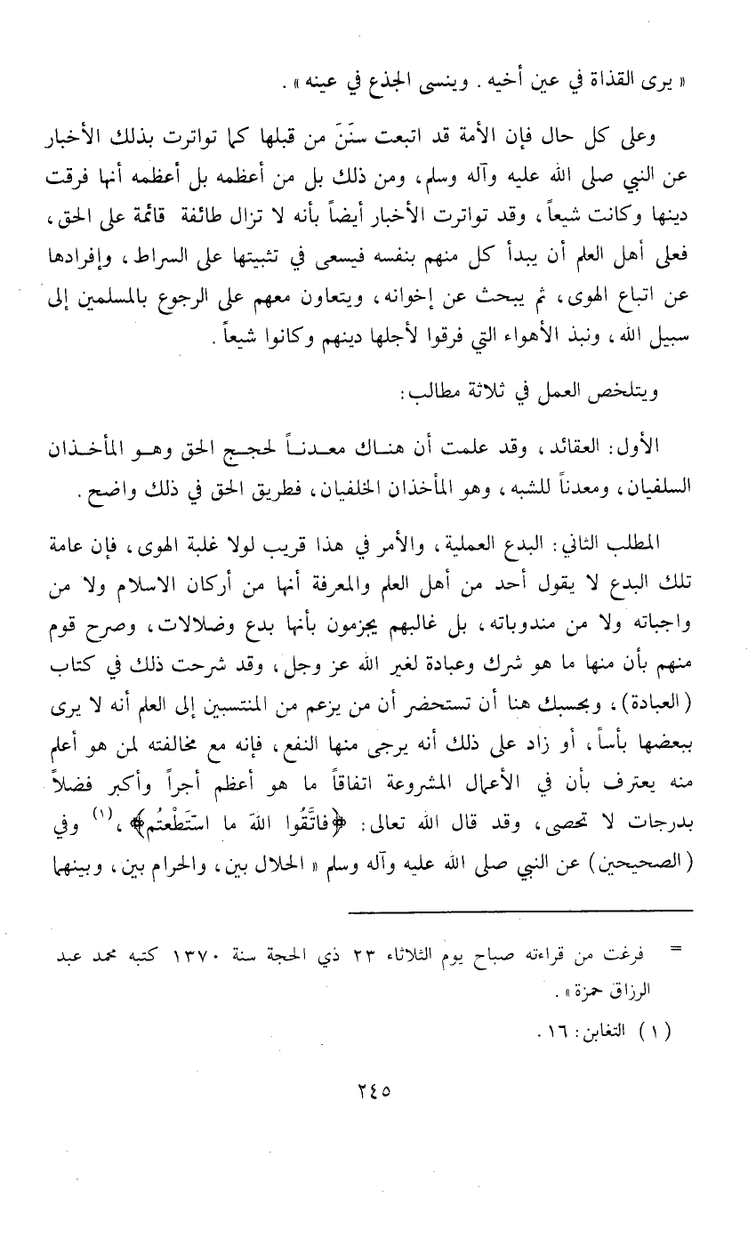 = فرغت من قراءته صباح يوم الثلاثاء 23 ذي الحجة سنة 1370 كتبه محمد عبد الرزاق حمزة» .