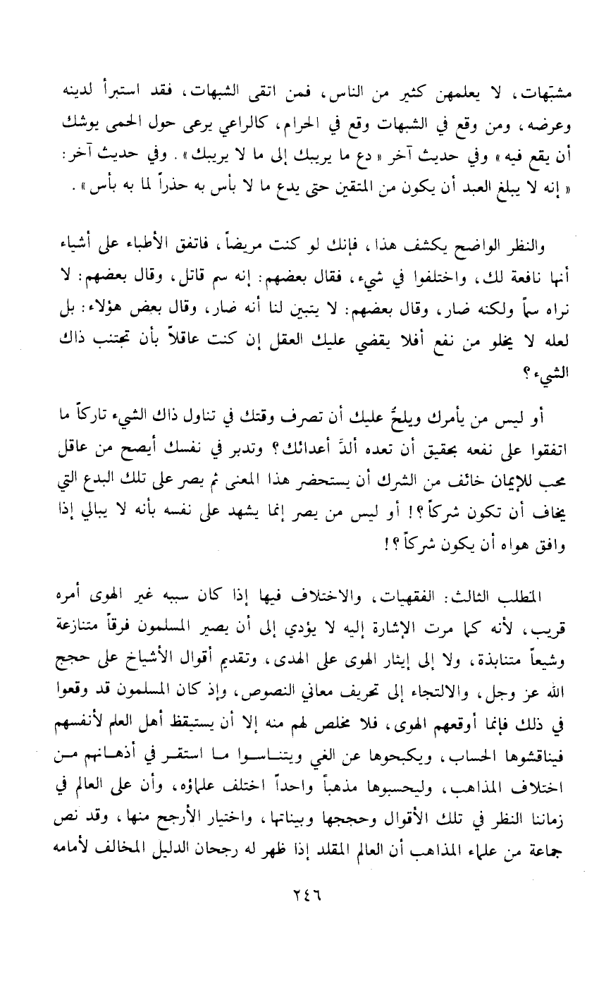 والنظر الواضح يكشف هذا، فإنك لوكنت مريضاً فاتفق الأطباء على أشياء أنها نافعة لك، واختلفوا في شيء، فقال بعضهم: أنه سم قاتل، وقال بعضهم: لا نراه سماً ولكنه ضار، وقال بعضهم: لا يتبين لنا أنه ضار، وقال بعض هؤلاء: بل لعله لا يخلومن نفع. أفلا يقضي عليك العقل إن كنت عاقلاً بأن تجتنب ذاك الشيء؟