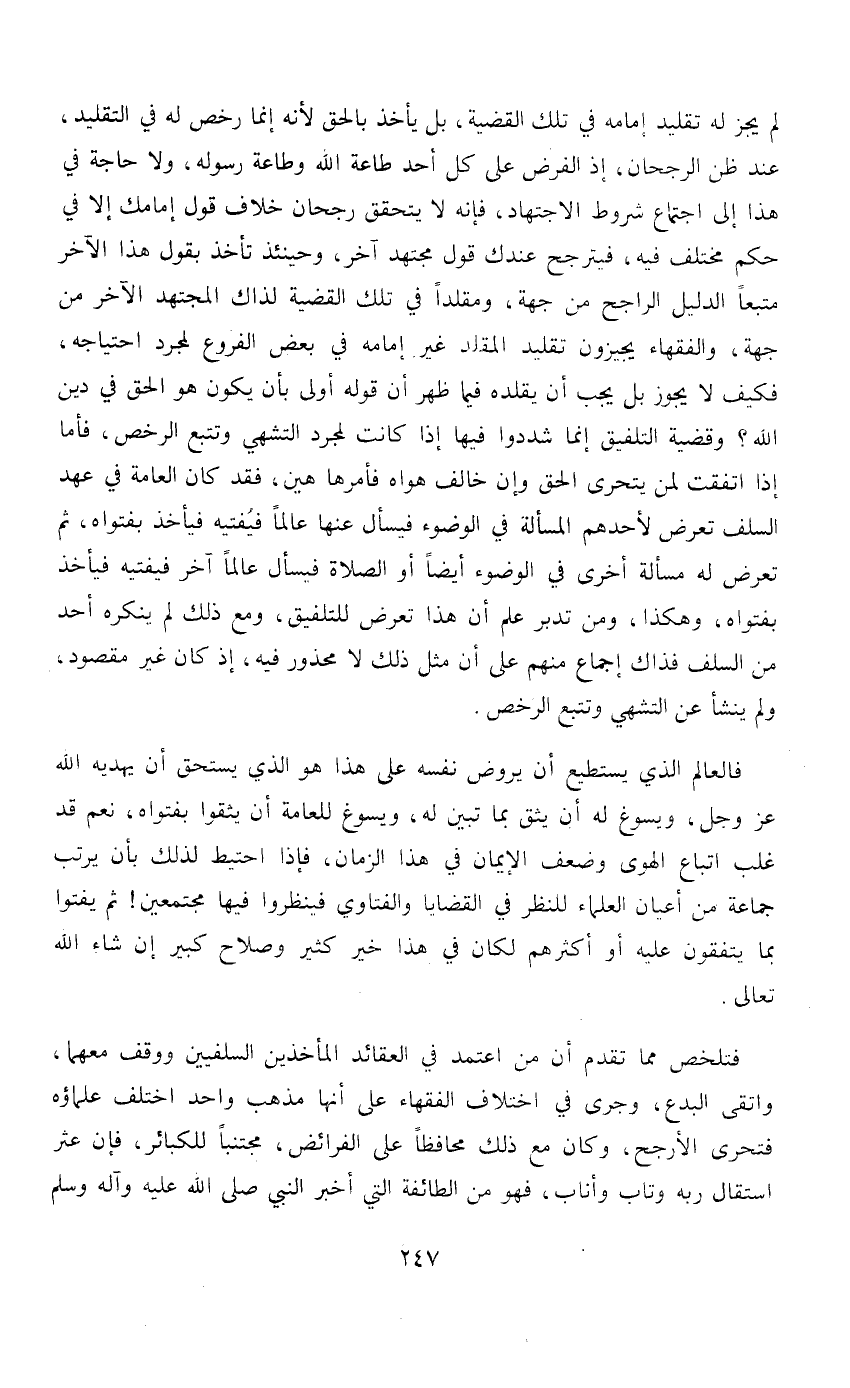 فتلخص مما تقدم أن من اعتمد في العقائد المأخذين السلفيين ووقف معها، واتقى البدع، وجرى في اختلاف الفقهاء على أنها مذهب واحد اختلف علماؤه فتحرى الأرجح، واكن مع ذلك محافظاً على لفرائض، مجتنباً للكبائر، فإن عثر استقال ربه وتاب وأناب، فهو من الطائفة التي أخبر النبي صلى الله عليه وآله وسلم
