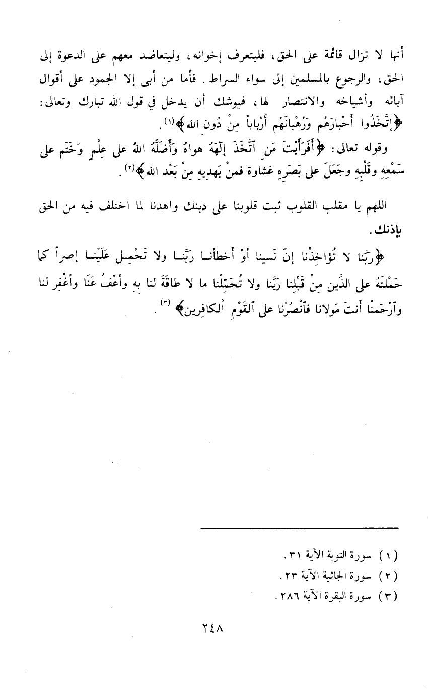 أنها لا تزال قائمة على الحق، فليتعرف إخوانه، وليتعاضد معهم على الدعوة إلى الحق، والرجوع بالمسلمين إلى سواء الصراط. فأما من أبى إلا الجمود على أقوال آبائه وأشياخه والانتصار لها، فيوشك أن يدخل في قول الله تبارك وتعالى: «اتَّخَذُوا أَحْبَارَهُمْ وَرُهْبَانَهُمْ أَرْبَاباً مِنْ دُونِ اللَّه» . التوبة: 31، وقوله تعالى: «أَفَرَأَيْتَ مَنِ اتَّخَذَ إِلَهَهُ هَوَاهُ وَأَضَلَّهُ اللَّهُ عَلَى عِلْمٍ وَخَتَمَ عَلَى سَمْعِهِ وَقَلْبِهِ وَجَعَلَ عَلَى بَصَرِهِ غِشَاوَةً فَمَنْ يَهْدِيهِ مِنْ بَعْدِ اللَّهِ» . الجاثية: 23.