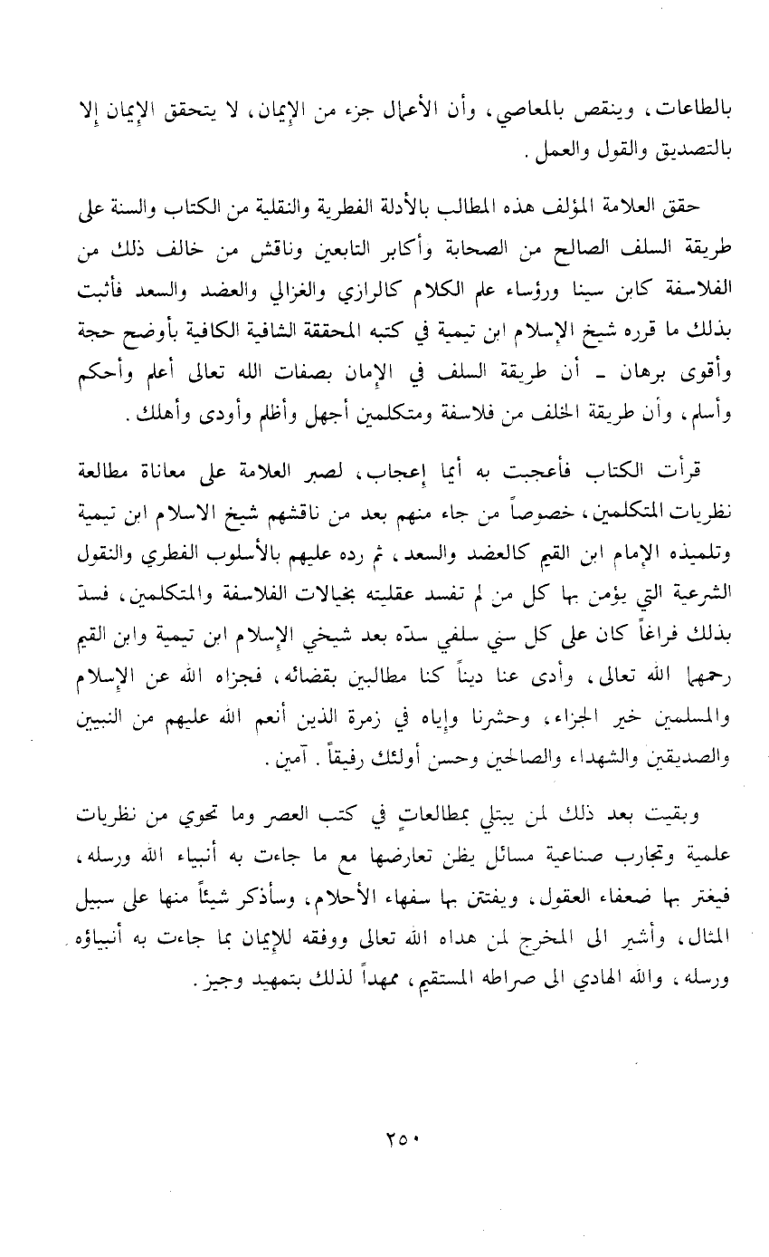 قرأت الكتاب فأعجبت به أيما إعجاب، لصبر العلامة على معاناة مطالعة نظريات المتكلمين خصوصاً من جاء منهم بعد من ناقشهم شيخ الإسلام أبن تيمية وتلميذه الإمام ابن القيم كالعضد والسعد، ثم رده عليهم بالأسلوب الفطري والنقول الشرعية التي يؤمن بها كل من لم تفسد عقيلته بخيالات الفلاسفة والمتكلمين، فسد بذلك فراغاً كن على كل سني سلفي سده بعد شيخ الإسلام ابن تيمية وابن القيم رحمهما الله تعالى، وأدى عنا ديناً كنا مطالبين بقضائه، فجزاه الله عن الإسلام والمسلمين خير الجزاء، وحشرنا وإياه في زمرة الذين أنعم الله عليهم من النبيين والصديقين والشهداء والصالحين وحسن أولئك رفيقا. آمين.