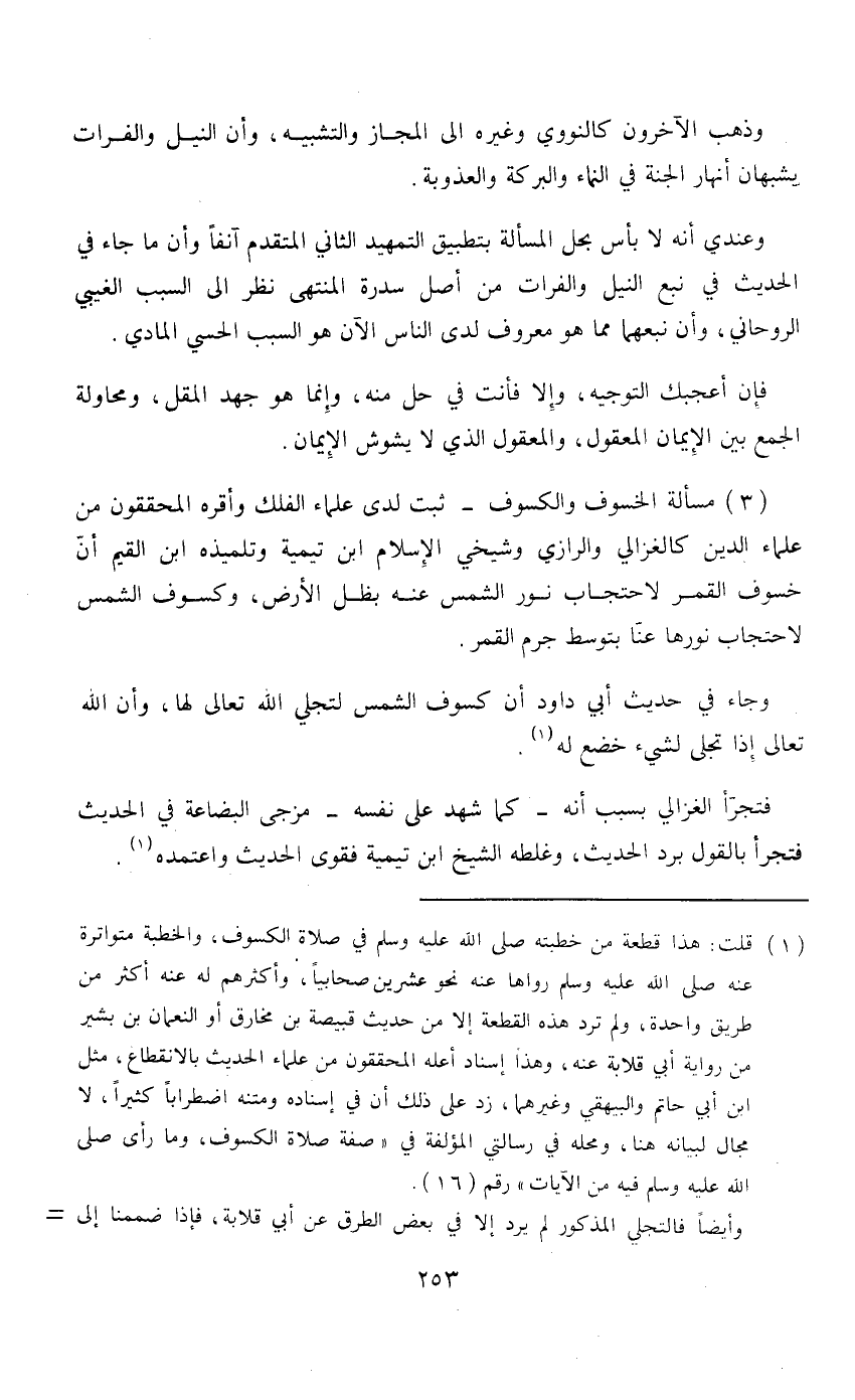 (3) مسألة الخسوف والكسوف - ثبت لدى علماء الفلك وأقره المحققون من علماء الدين كالغزالي والرازي وشيخ الإسلام ابن تيمية وتلميذه ابن القيم إن خسوف القمر لاحتجاب نور الشمس عنه بظل الأرض، وكسوف الشمس لاحتجاب نورها عنا بتوسط جرم القمر.