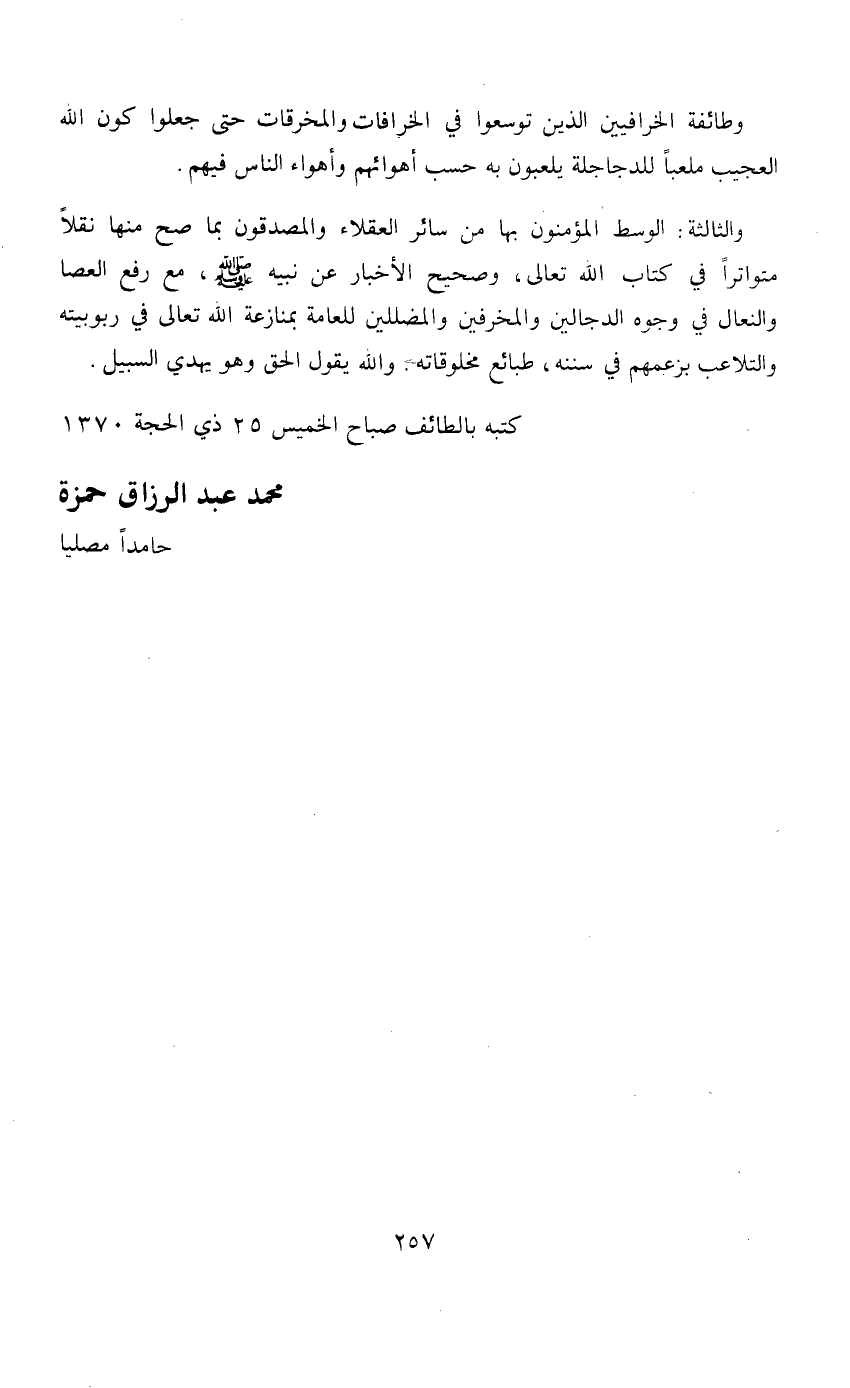 والثالثة: الوسط المؤمن بها من سائر العقلاء والمصدقون بما صح منها نقلاً متواتراً في كتاب الله تعالى، وصحيح الأخبار عن نبيه - صلى الله عليه وسلم -، مع رفع العصا والنعال في وجوه الدجالين والمخرفين والمظلمين للعامة بمنازعة الله تعالى في ربوبيته والتلاعب بزعمهم في سننه، طبائع مخلوقاته.