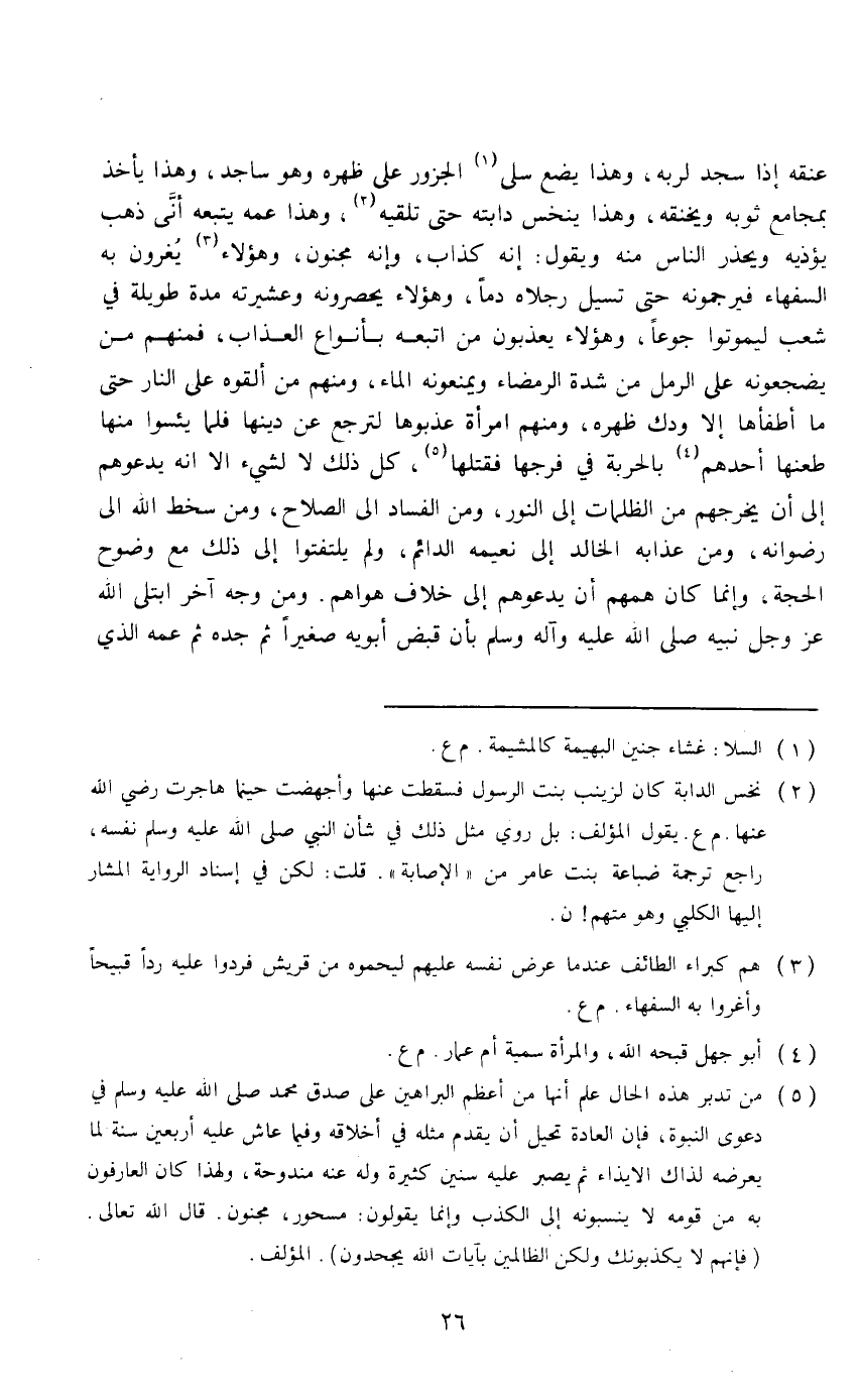 عنقه إذا سجد لربه، وهذا يضع سلى (1) الجزور على ظهره وهو ساجد، وهذا يأخذ بمجامع ثوبه ويخنقه، وهذا ينخس دابته حتى تلقيه (2) ، وهذا عمه يتبعه أنى ذهب يؤذيه ويحذر الناس منه ويقول: إنه كذاب، وإنه مجنون، وهؤلاء (3) يغرون به السفهاء فيرجمونه حتى تسيل رجلاه دماً، وهؤلاء يحصرونه وعشيرته مدة طويلة في شعب ليموتوا جوعاً، وهؤلاء يعذبون من اتبعه بأنواع العذاب، فمنهم من يضجعونه على الرمل في شدة الرمضاء ويمنعونه الماء، ومنهم من ألقوه على النار حتى ما أطفأها إلا ودك ظهره، ومنهم امرأة عذبوها لترجع عن دينها فلما يئسوا منها طعنها أحدهم (4) بالحربة في فرجها فقتلها، (5) كل ذلك لا لشيء إلا أنه يدعوهم إلى أن يخرجهم من الظلمات إلى النور، ومن الفساد إلى الصلاح، ومن سخط الله إلى رضوانه، ومن عذابه الخالد إلى نعيمه الدائم، ولم يلتفوا إلى ذلك مع وضوح الحجة، وإنما كان همهم أنه يدعوهم إلى خلاف هواهم. ومن وجه آخر ابتلى الله عز وجل نبيه صلى الله عليه وآله وسلم بأن قبض أبويه صغيراً ثم جده ثم عمه الذي