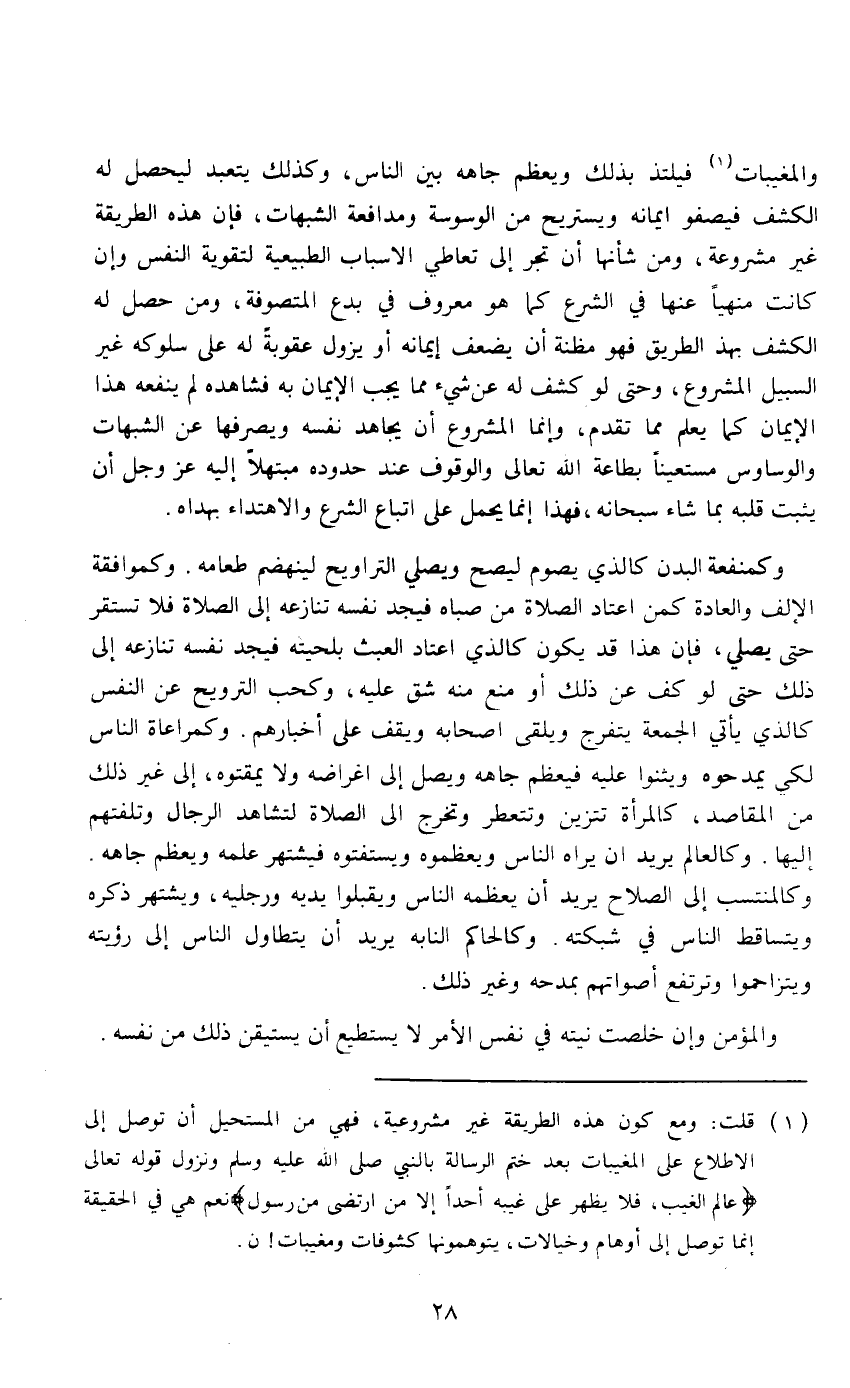والمغيبات (1) فيلتذ بذلك ويعظم جاهه بين الناس، وكذلك يتعبد ليحصل له الكشف فيصفوا إيمانه ويستريح من الوسوسة ومدافعة الشبهات، فإن هذه الطريقة غير مشروعة، ومن شأنها أن تجر إلى تعاطي الأسباب الطبيعية لتقوية النفس وإن كانت منهياً عنها في الشرع كما هو معروف في بدع المتصوفة، ومن حصل له الكشف بهذه الطريق فهو مظنة ان يضعف أيمانه أو يزول عقوبة له على سلوكه غير السبيل المشروع، حتى لوكشف له عن شيء مما يجب الإيمان به فشاهده لم ينفعه هذا الإيمان كما يعلم مما تقدم. وإنما المشروع أن يجاهد نفسه ويصرفها عن الشبهات والوساوس مستعيناً بطاعة الله تعالى والوقوف عند حدوده مبتهلاً إليه عز وجل أن يثبت قلبه بما شاء سبحانه، فهذا إنما يحمل على إتباع الشرع والاهتداء بهذا.