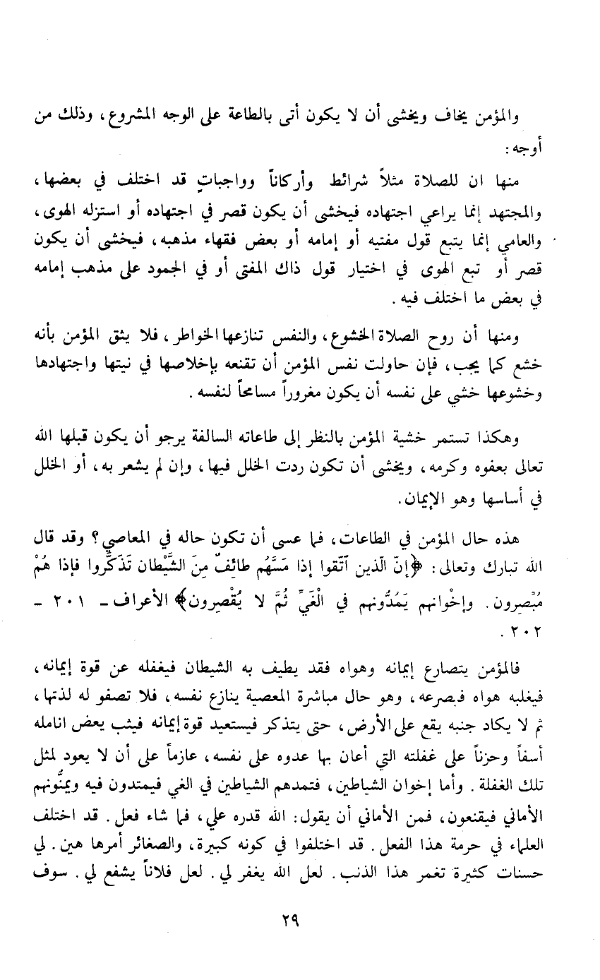هذه حال المؤمن في الطاعات، فما عسى أن تكون حاله في المعاصي؟ وقد قال الله تبارك وتعالى: «إِنَّ الَّذِينَ اتَّقَوْا إِذَا مَسَّهُمْ طَائِفٌ مِنَ الشَّيْطَانِ تَذَكَّرُوا فَإِذَا هُمْ مُبْصِرُونَ وَإِخْوَانُهُمْ يَمُدُّونَهُمْ فِي الْغَيِّ ثُمَّ لا يُقْصِرُونَ الأعراف - 201 - 202.
